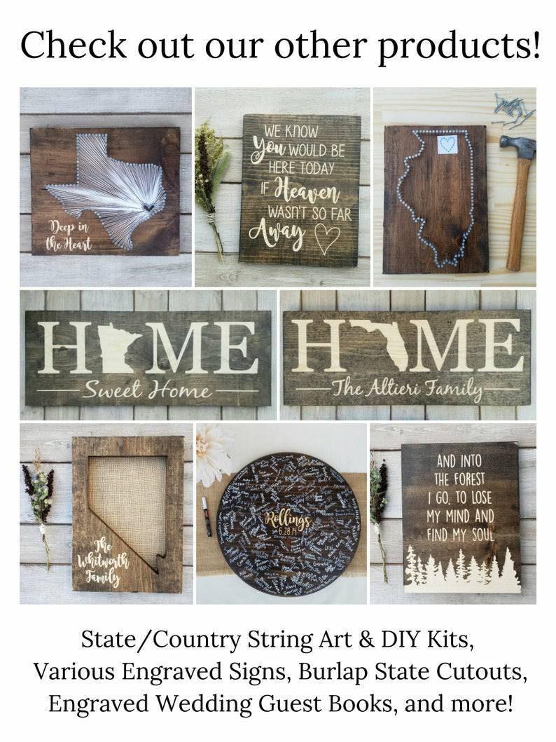 A custom engraving add-on is available for String Art, DIY kits, & Burlap Signs - the design is engraved within the wood revealing the natural wood color below, knots and all.