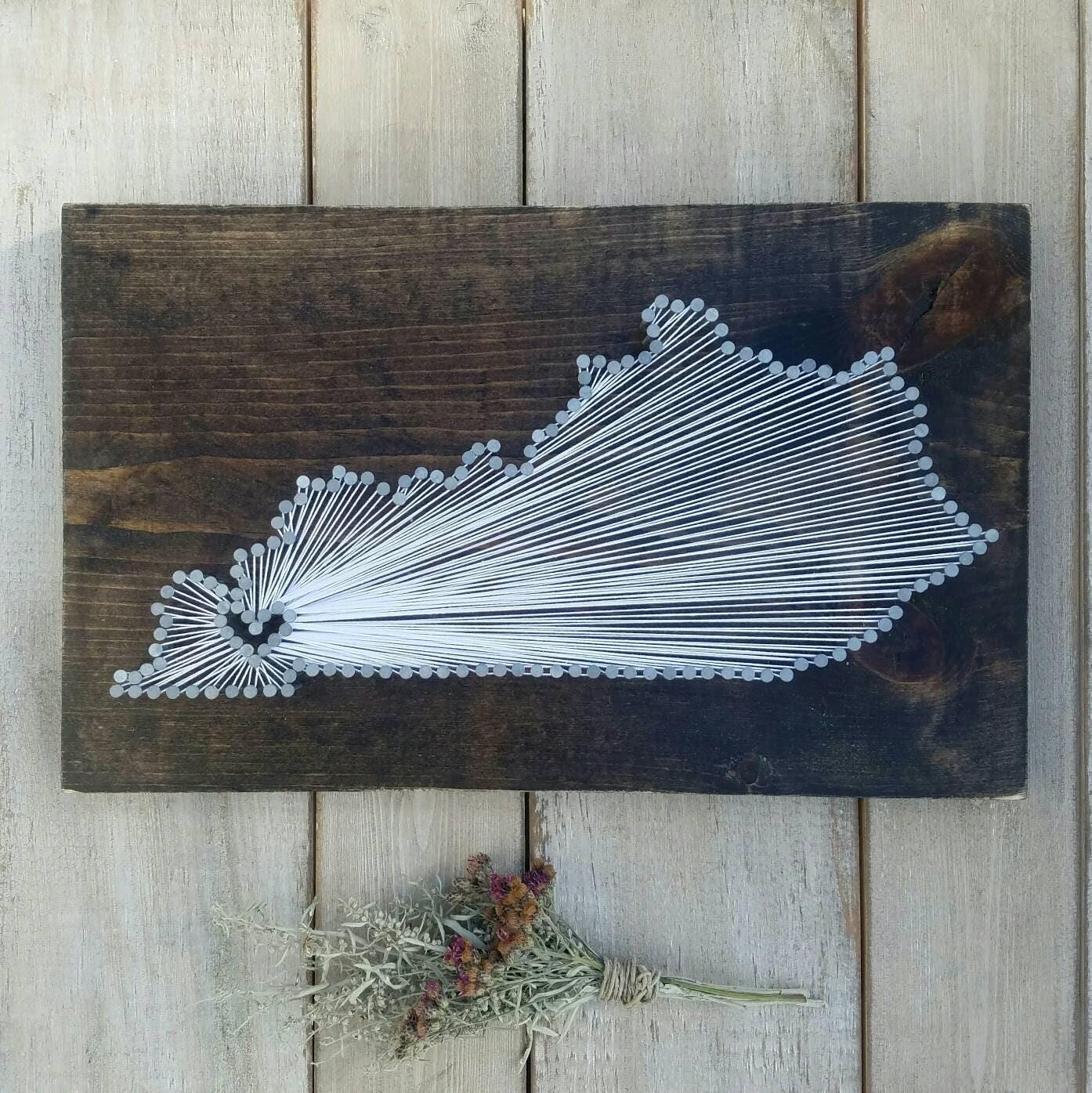 The DIY kit option include everything you need to create your own state string art sign (except a hammer!). The dirty work is already done as the board comes cut and stained with the nail holes already marked out. All you need to do is grab a hammer, pound in the provided nails, and get busy stringing!