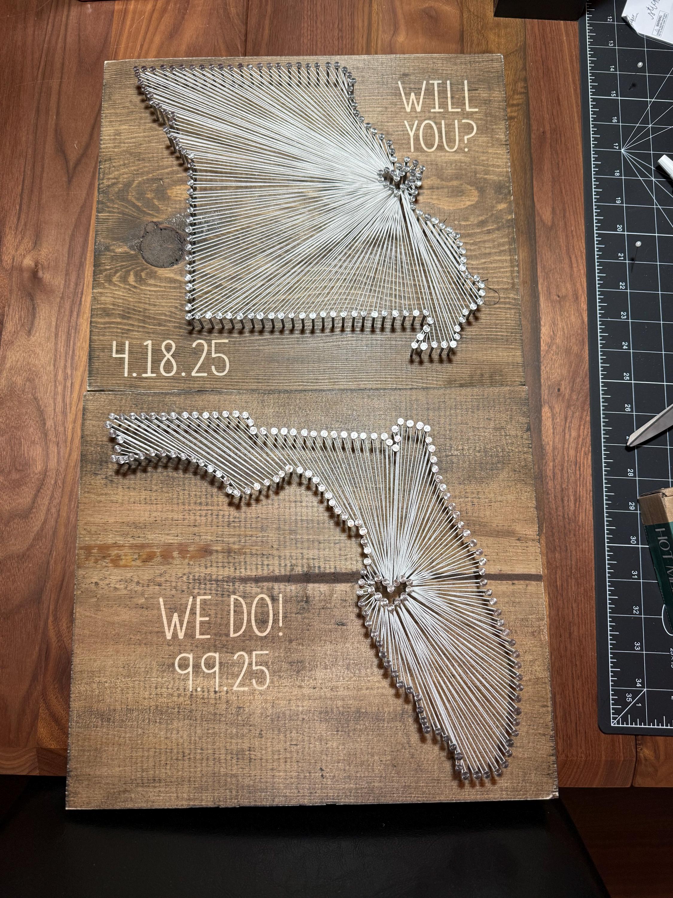 All pieces are crafted with attention to detail; note that wood boards may vary slightly due to their natural wood character. The back of the sign is left unstained as it will be out of sight when displayed. **Heart Locations on the border will be pulled away from the border so that they are completely surrounded by string --unless-- your heart location is in a tight area or requested otherwise. Heart is left open unless a request is made for it to be filled with another string color.