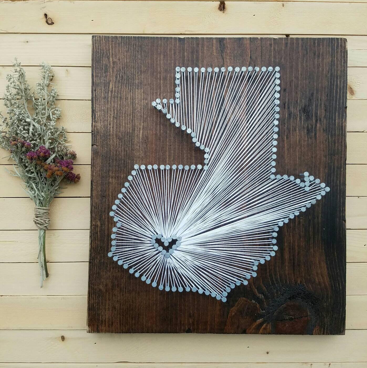 The DIY kit option include everything you need to create your own state string art sign (except a hammer!). The dirty work is already done as the board comes cut and stained with the nail holes already marked out. All you need to do is grab a hammer, pound in the provided nails, and get busy stringing!