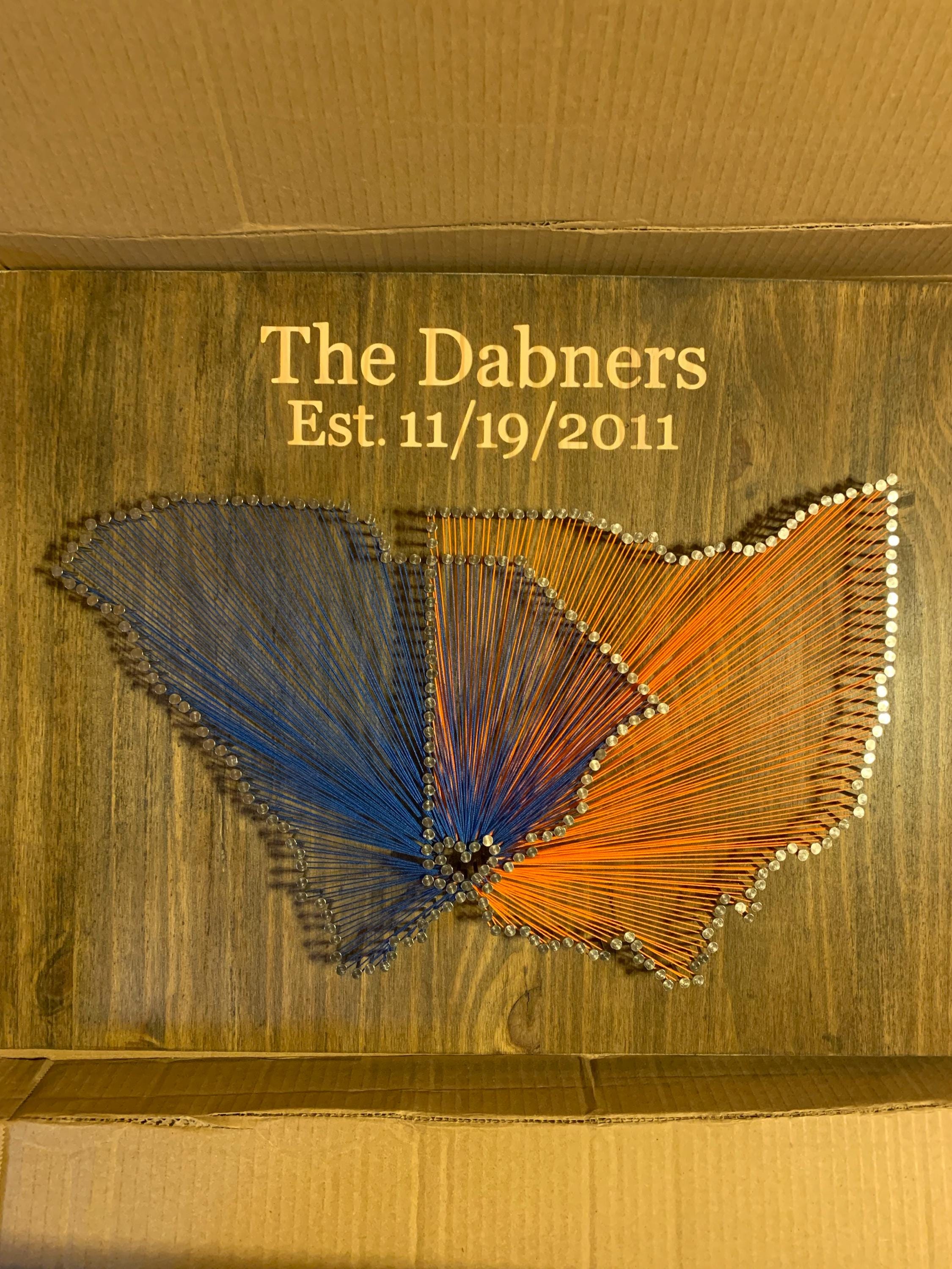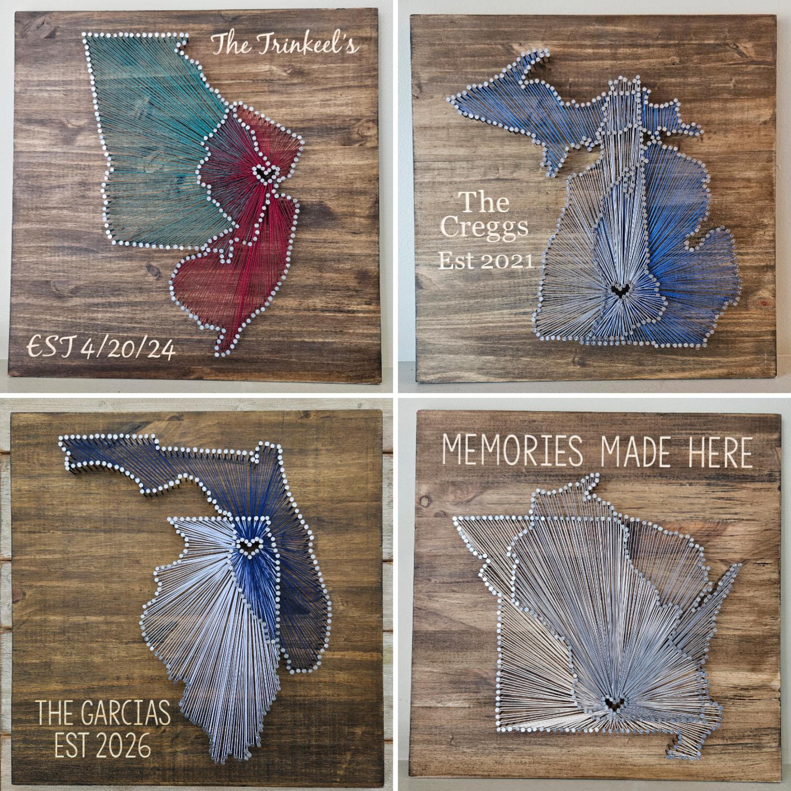 A super cute string art sign for couples from different states(or countries/provinces)...a great wedding gift, cotton anniversary gift, or house-warming gift!