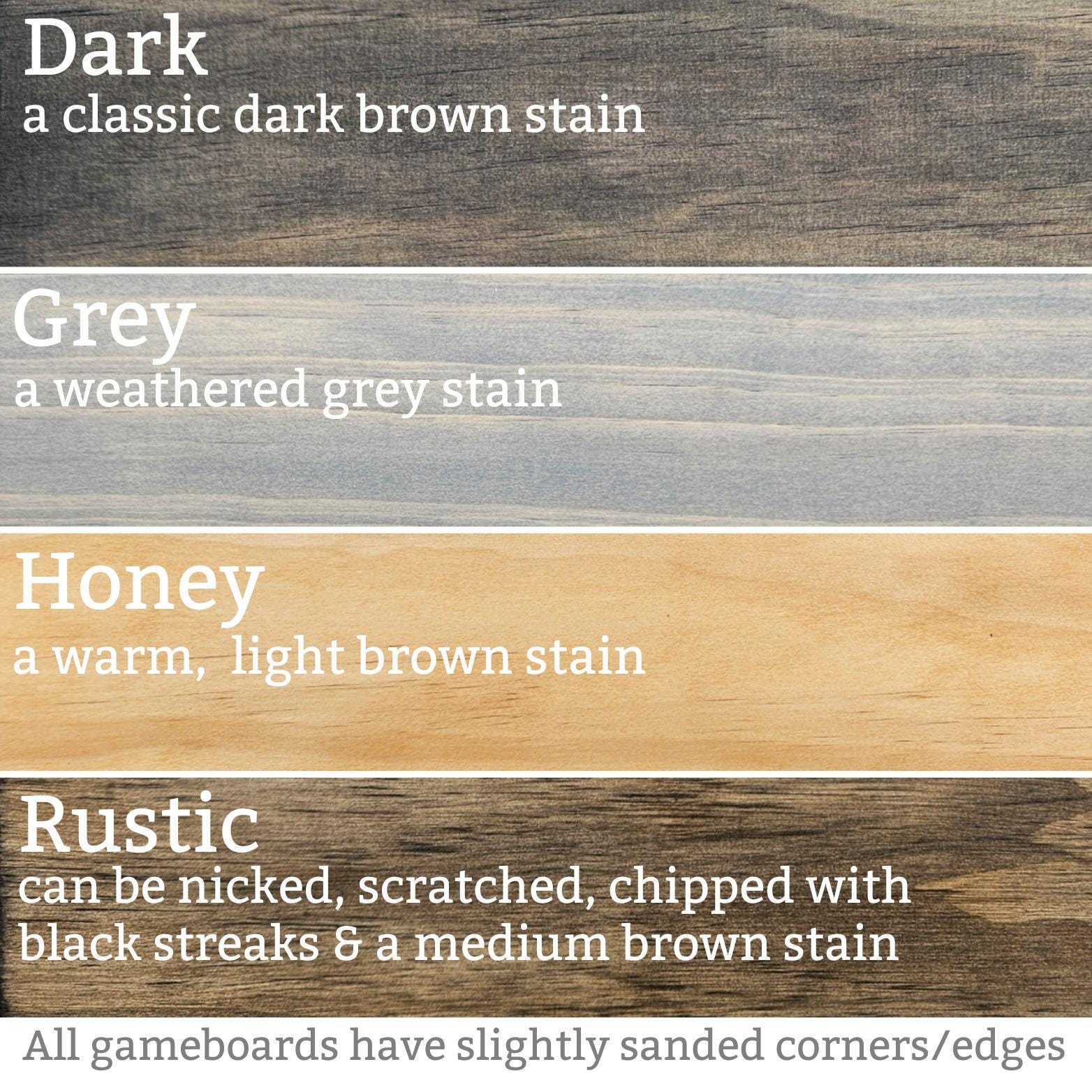 Wow! This is a beautiful cribbage board. The personalization is perfect, just as I requested. This in is the dark brown and I love it. The craved name really stands out on with the dark finish. Bought this as a gift and I am proud to give it. The pegs are a great quality too and I like how their storage are is routed out so carefully. All of the peg holes are drilled uniformly (depth and diameter)