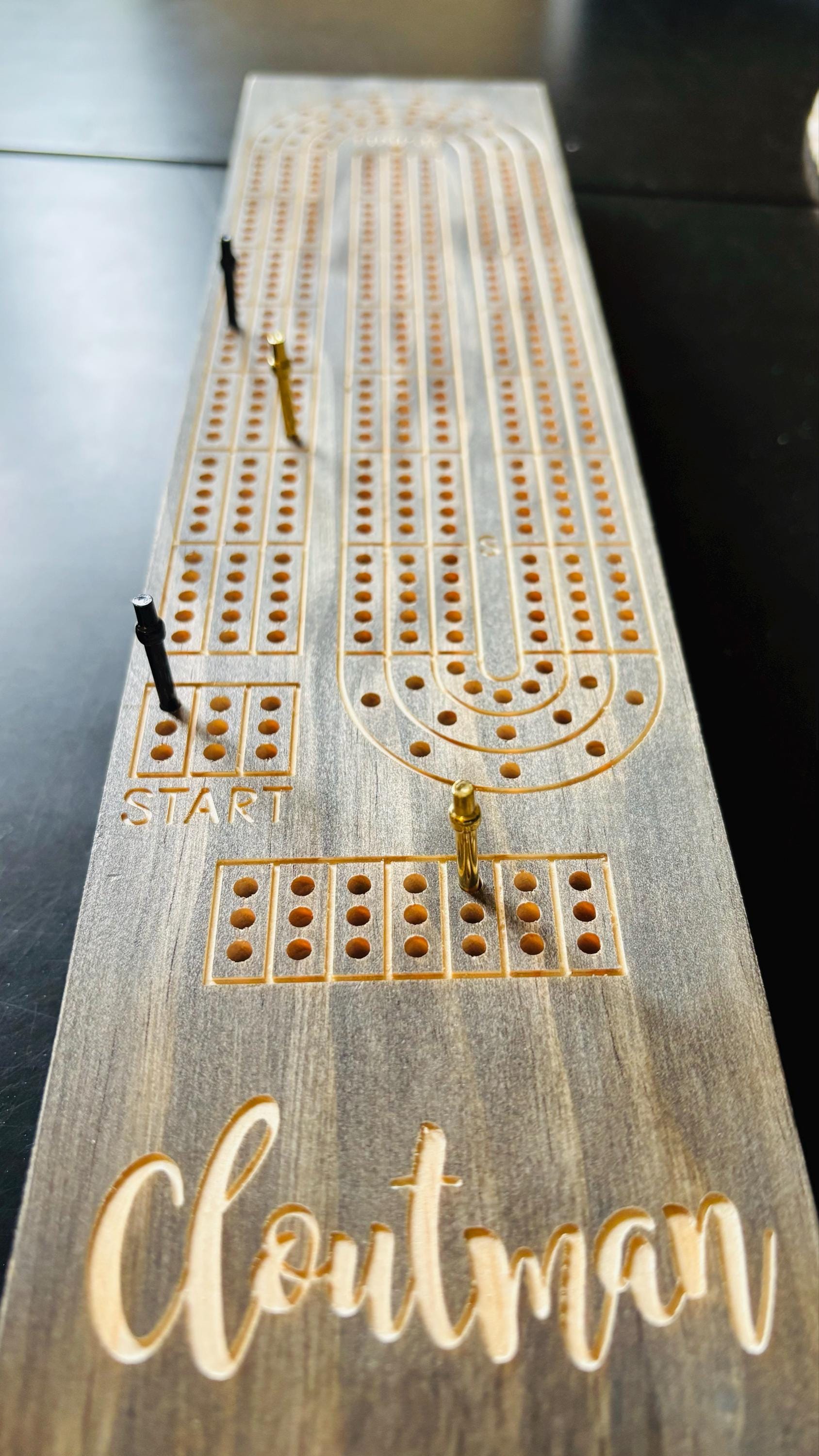 The track lines and custom design are engraved within the wood and reveal the natural wood color below while each peg hole is precisely placed and uniformly drilled - our cribbage boards are flawless as every detail is mapped out and executed by our custom in-house CNC machine.