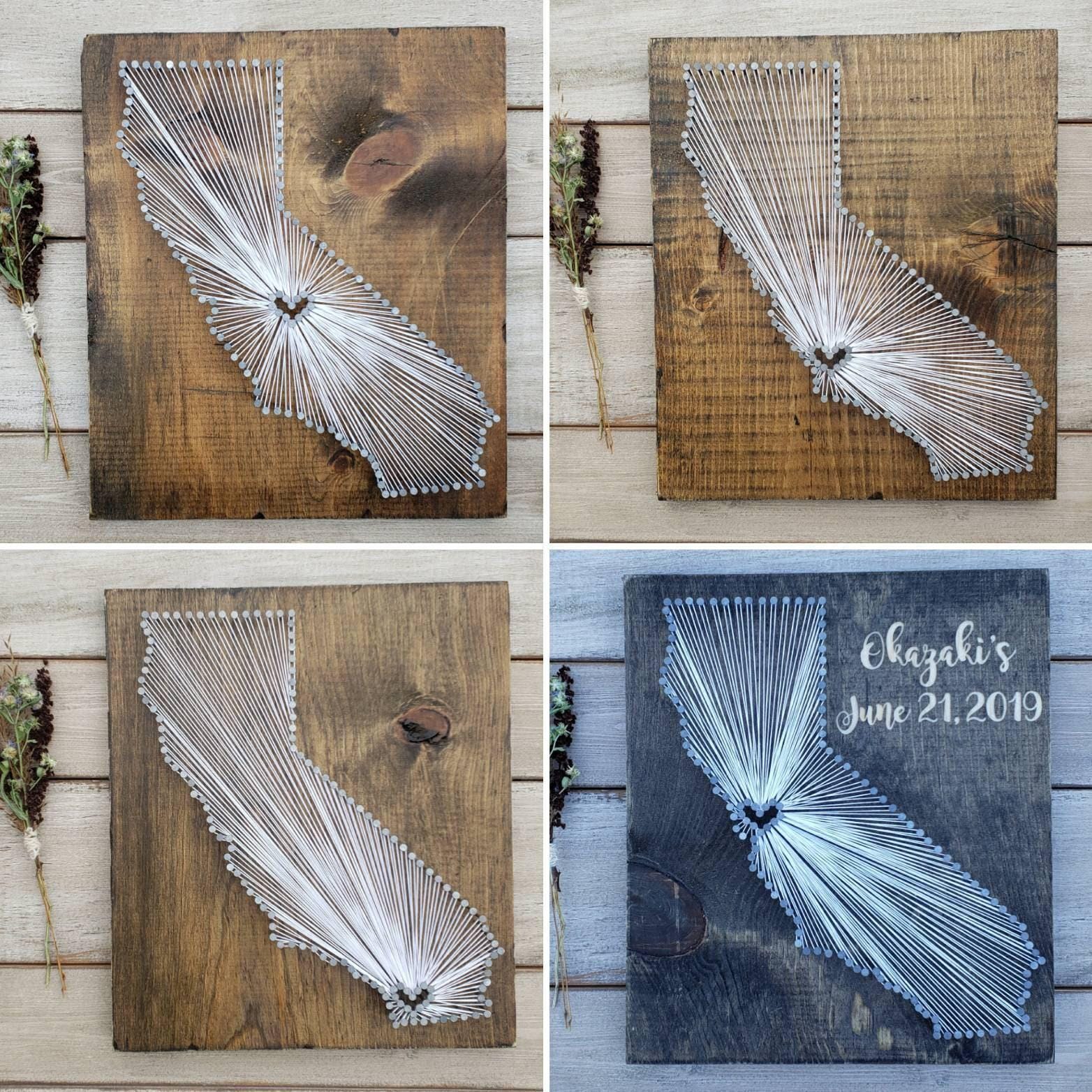 The DIY kit option include everything you need to create your own state string art sign (except a hammer!). The dirty work is already done as the board comes cut and stained with the nail holes already marked out. All you need to do is grab a hammer, pound in the provided nails, and get busy stringing!