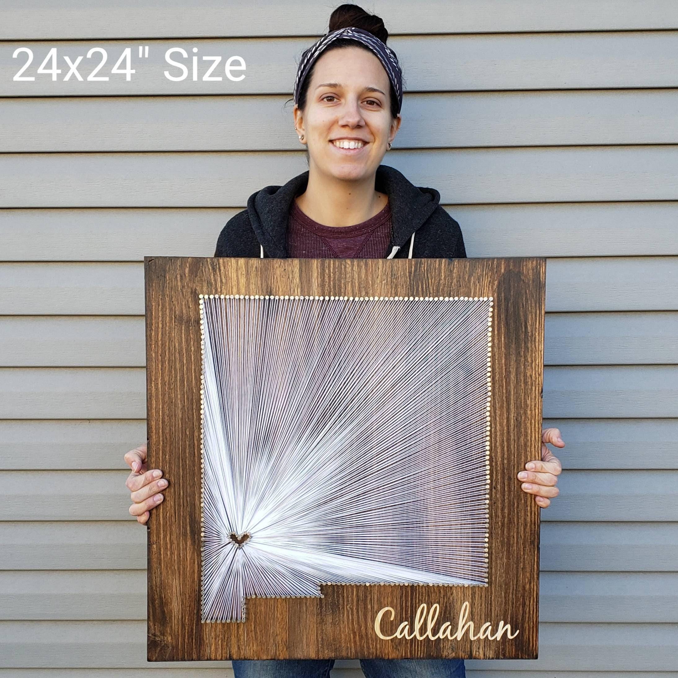 The DIY kit option include everything you need to create your own state string art sign (except a hammer!). The dirty work is already done as the board comes cut and stained with the nail holes already marked out. All you need to do is grab a hammer, pound in the provided nails, and get busy stringing!