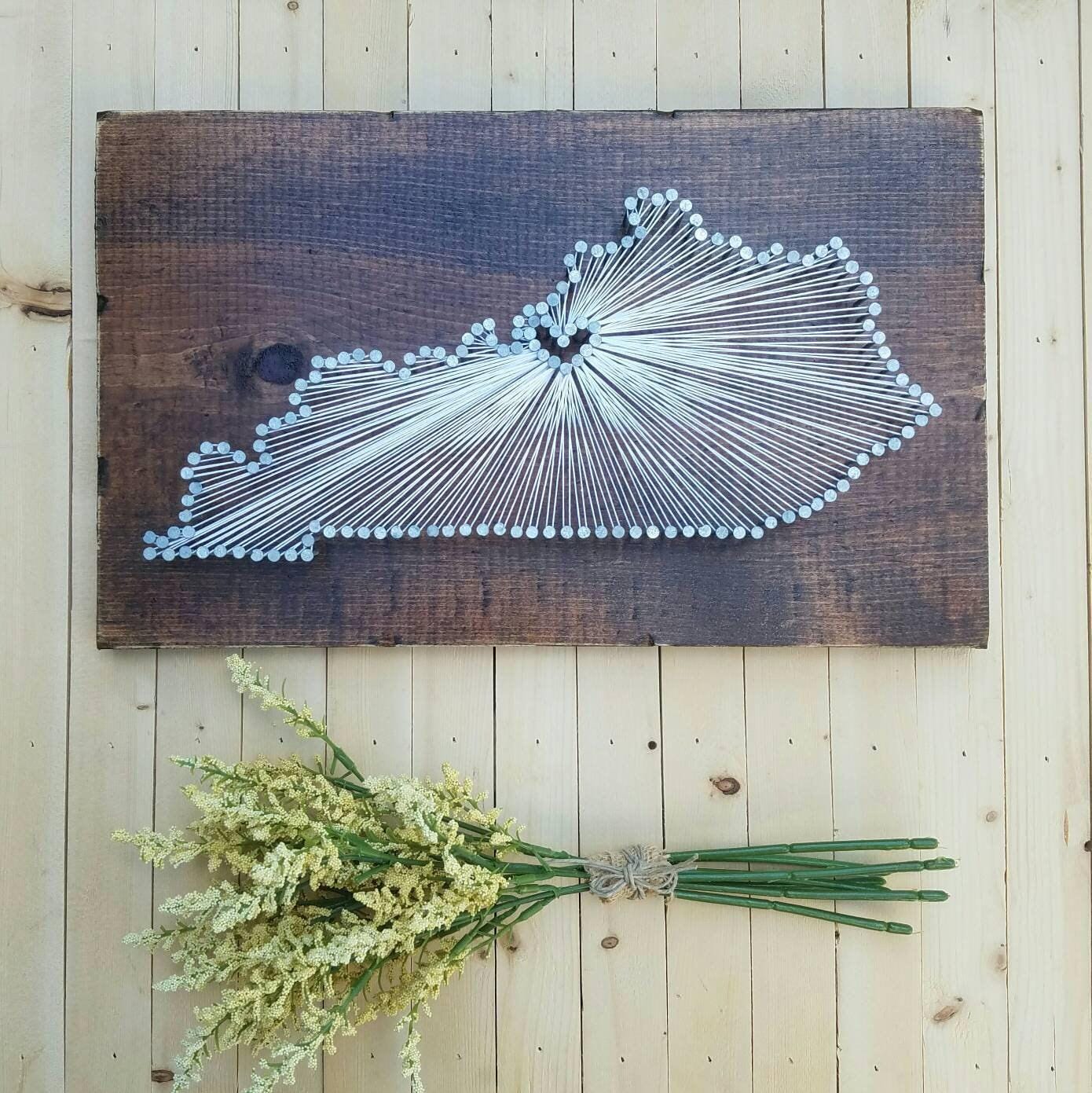 The DIY kit option include everything you need to create your own state string art sign (except a hammer!). The dirty work is already done as the board comes cut and stained with the nail holes already marked out. All you need to do is grab a hammer, pound in the provided nails, and get busy stringing!