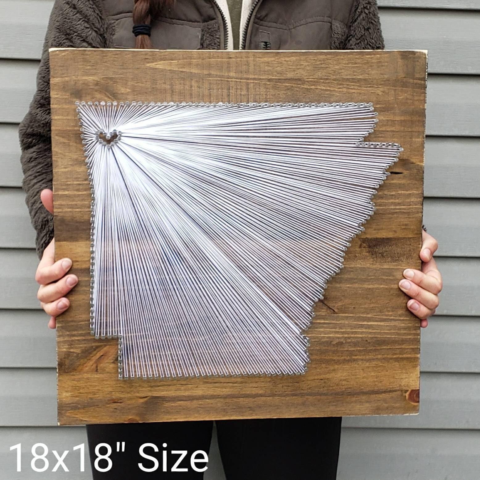 The DIY kit option include everything you need to create your own state string art sign (except a hammer!). The dirty work is already done as the board comes cut and stained with the nail holes already marked out. All you need to do is grab a hammer, pound in the provided nails, and get busy stringing!