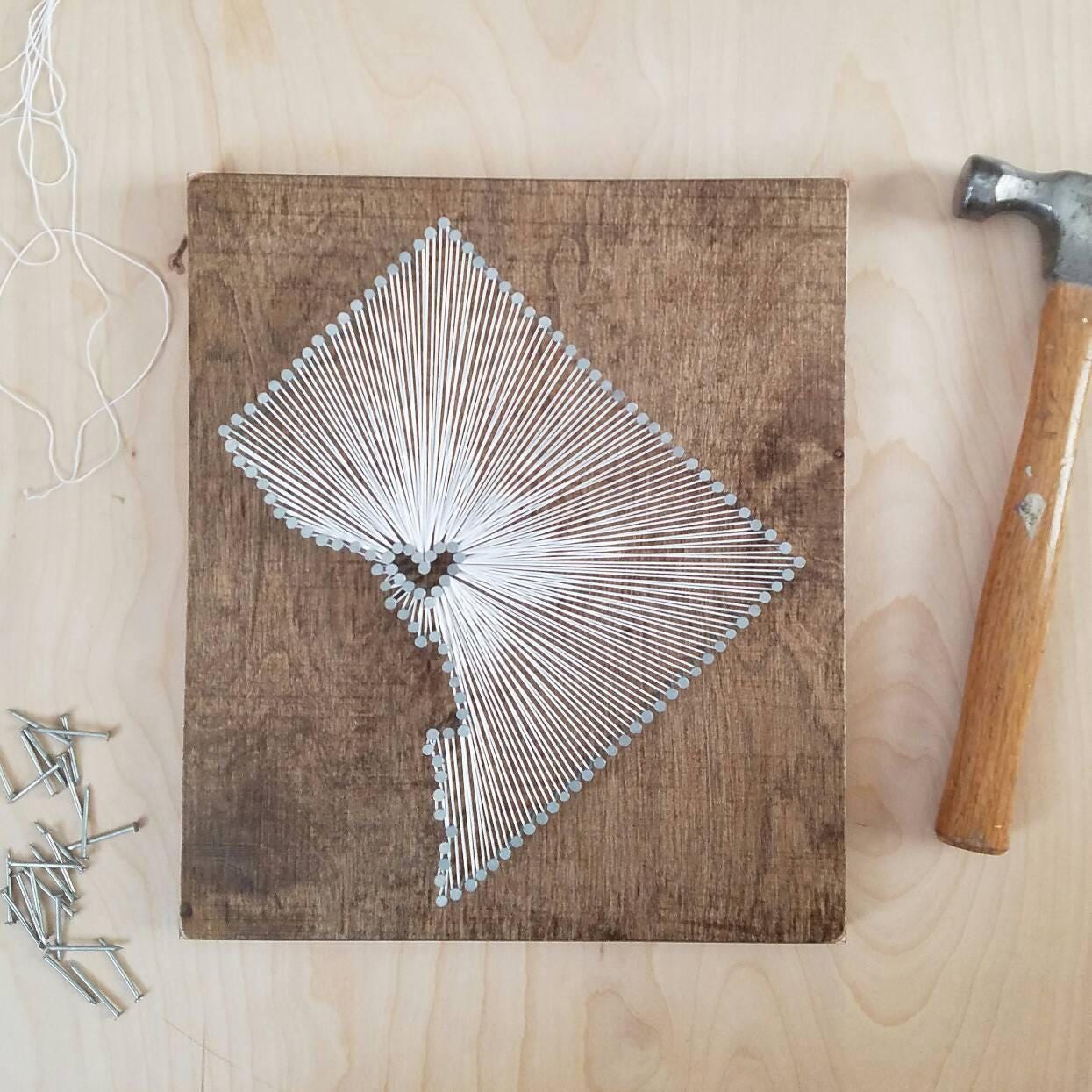 The DIY kit option include everything you need to create your own state string art sign (except a hammer!). The dirty work is already done as the board comes cut and stained with the nail holes already marked out. All you need to do is grab a hammer, pound in the provided nails, and get busy stringing!