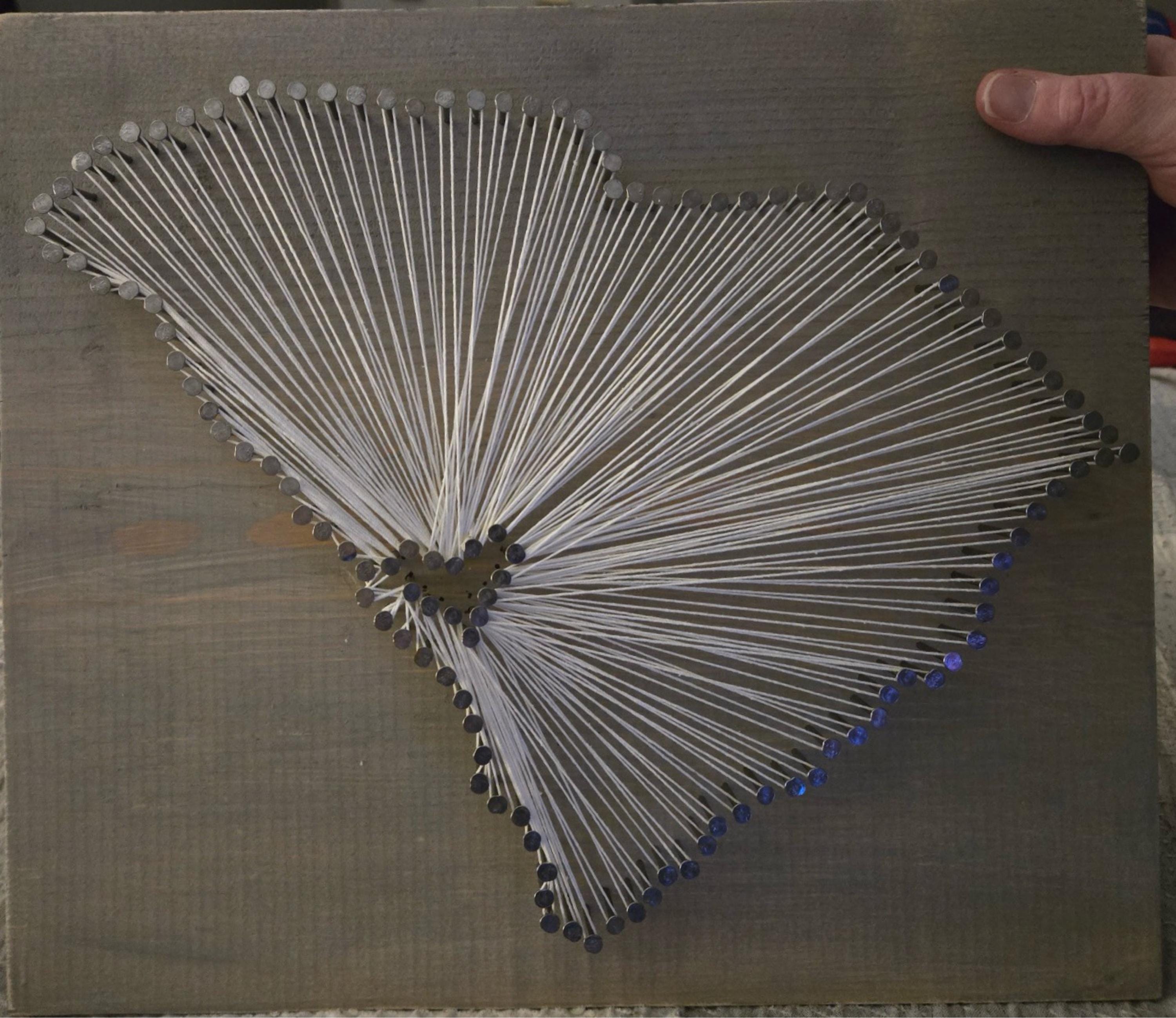 In these kits you will find everything you need to create your own state string art sign (except a hammer!). The dirty work is already done as the board comes cut and stained with the nail holes already marked out. All you need to do is grab a hammer, pound in the provided nails, and get busy stringing!