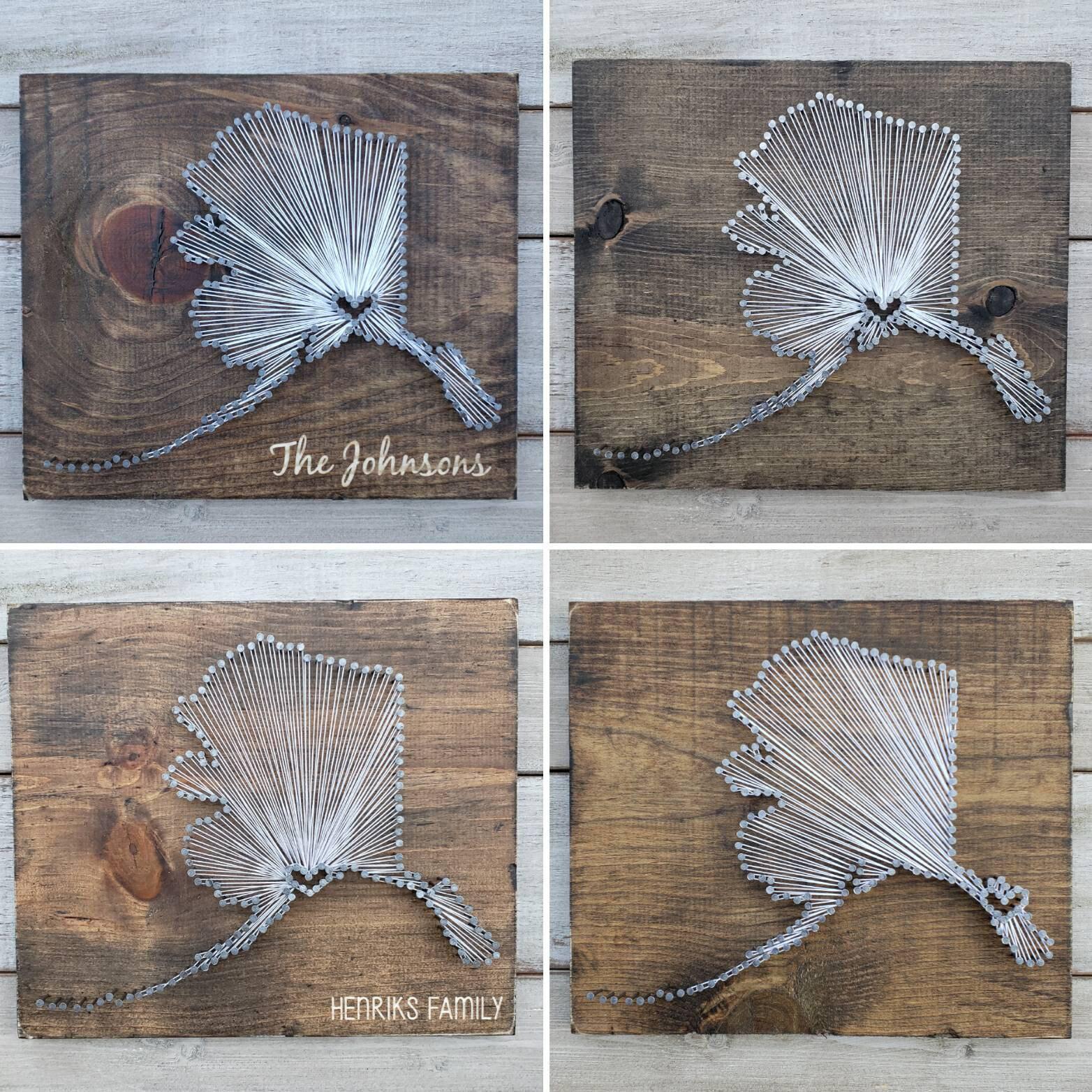 The DIY kit option include everything you need to create your own state string art sign (except a hammer!). The dirty work is already done as the board comes cut and stained with the nail holes already marked out. All you need to do is grab a hammer, pound in the provided nails, and get busy stringing!