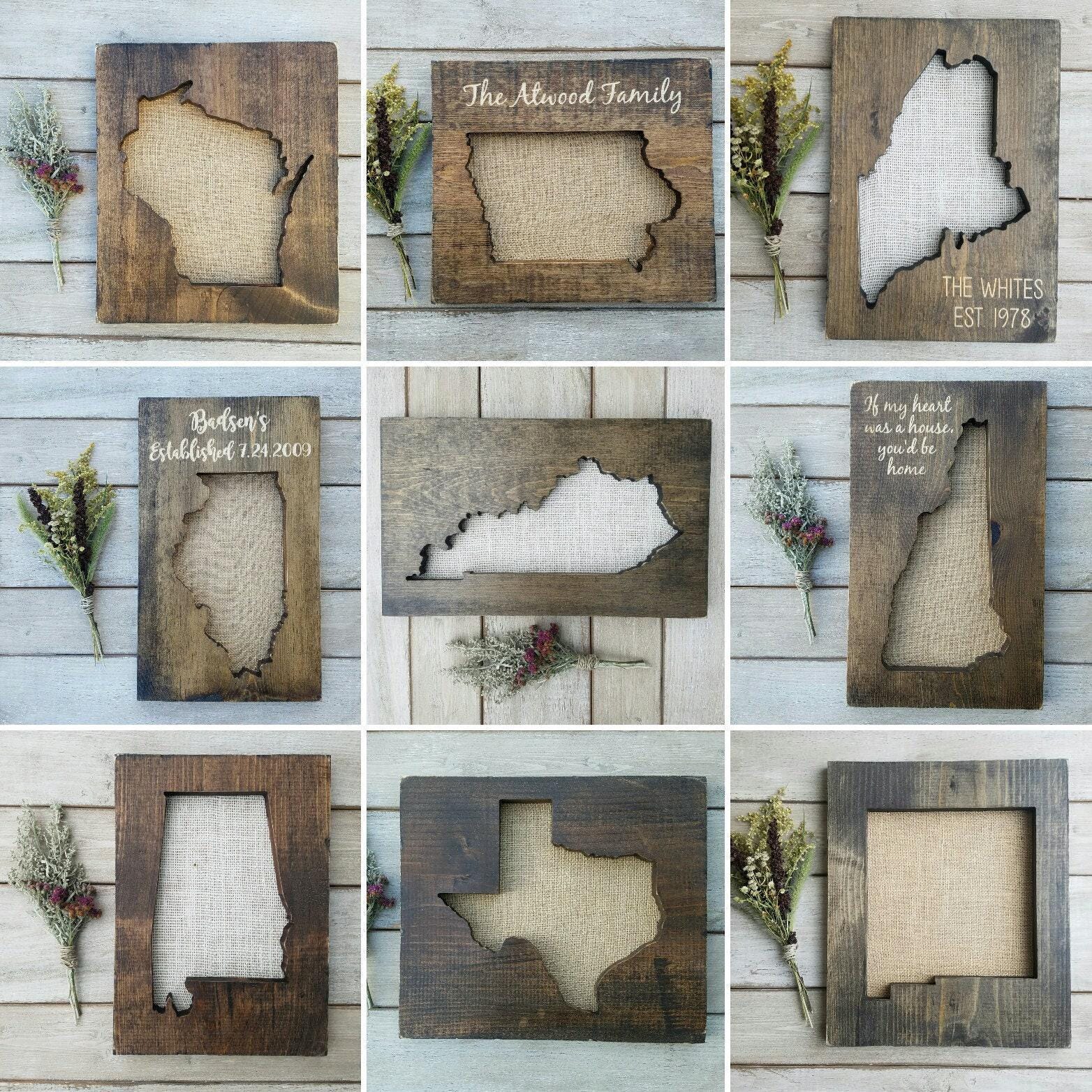 - Tan burlap is securely fastened to the back of each sign to beautifully highlight the state shape