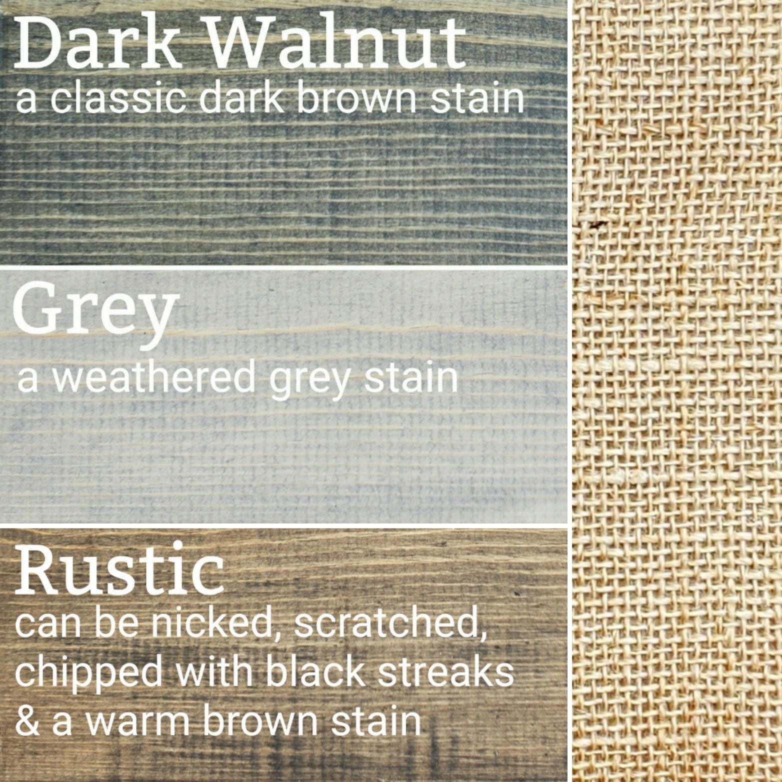 - Made from wood stained in your choice of dark walnut, grey, or rustic finish with sanded edges for a natural look