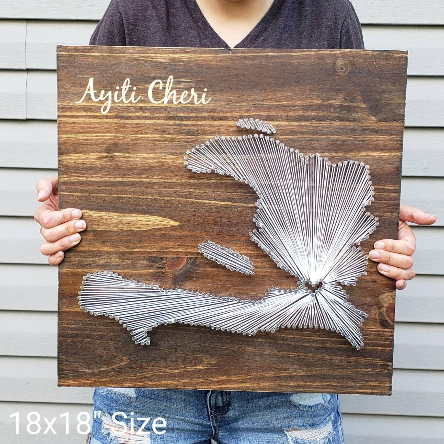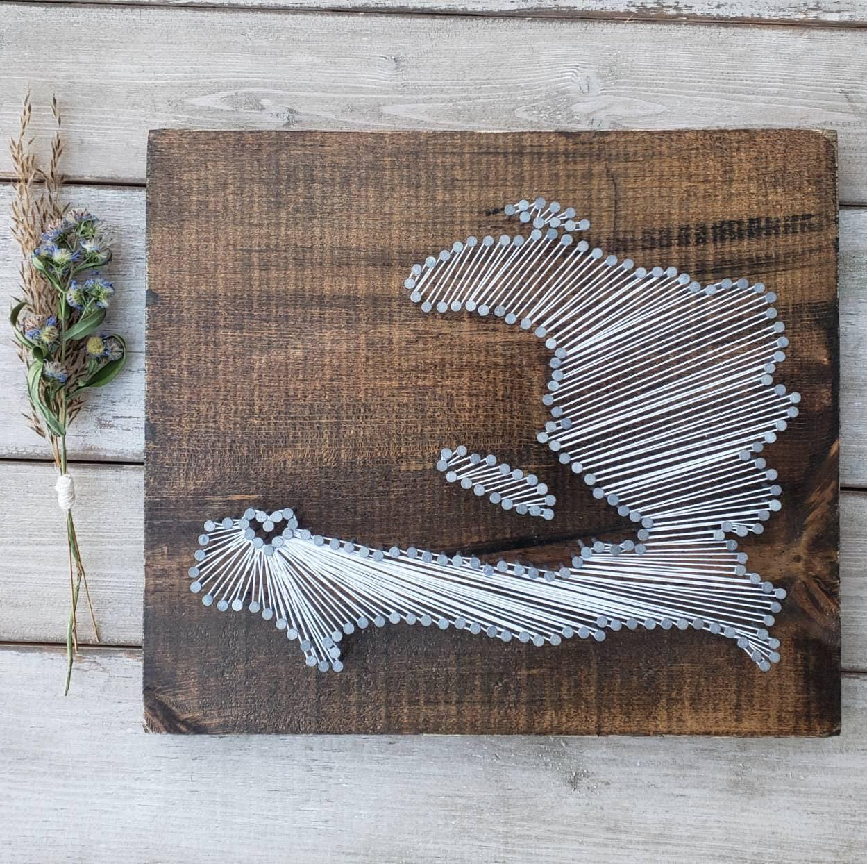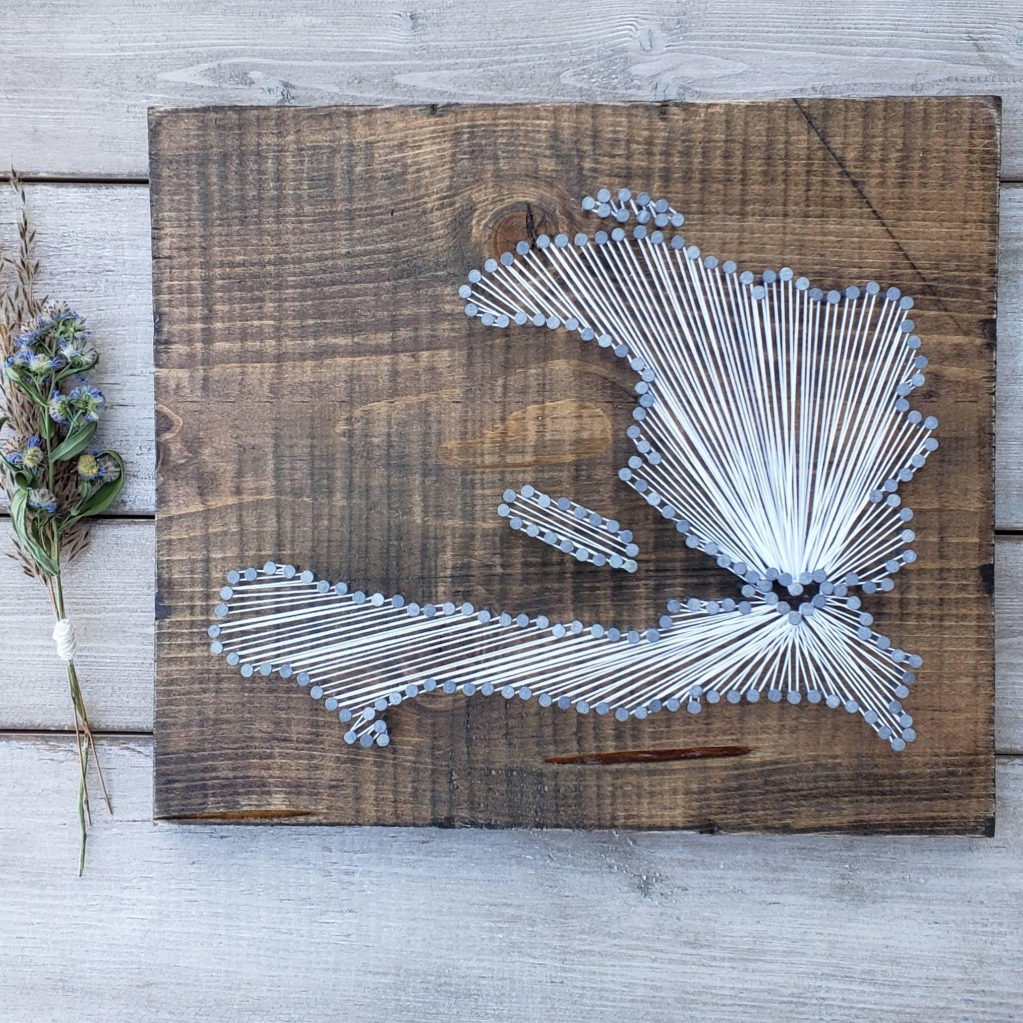 The DIY kit option include everything you need to create your own state string art sign (except a hammer!). The dirty work is already done as the board comes cut and stained with the nail holes already marked out. All you need to do is grab a hammer, pound in the provided nails, and get busy stringing!