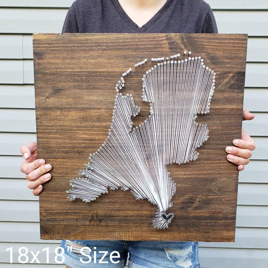 The DIY kit option include everything you need to create your own state string art sign (except a hammer!). The dirty work is already done as the board comes cut and stained with the nail holes already marked out. All you need to do is grab a hammer, pound in the provided nails, and get busy stringing!