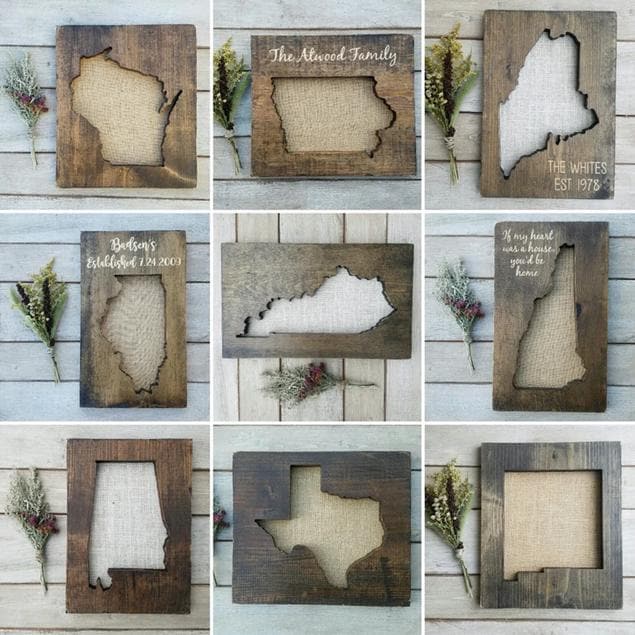 All signs arrive ready to hang and sizes are listed in the drop-down menu - each state is set on the board size that best showcases it's shape. The wood is stained your choice of dark walnut, grey, or our rustic wood look. All options have sanded edges and board appearance may vary from the pictures since each piece of wood has it's own character and uniqueness. Tan burlap is fastened to the back of the sign to compliment the wood board.