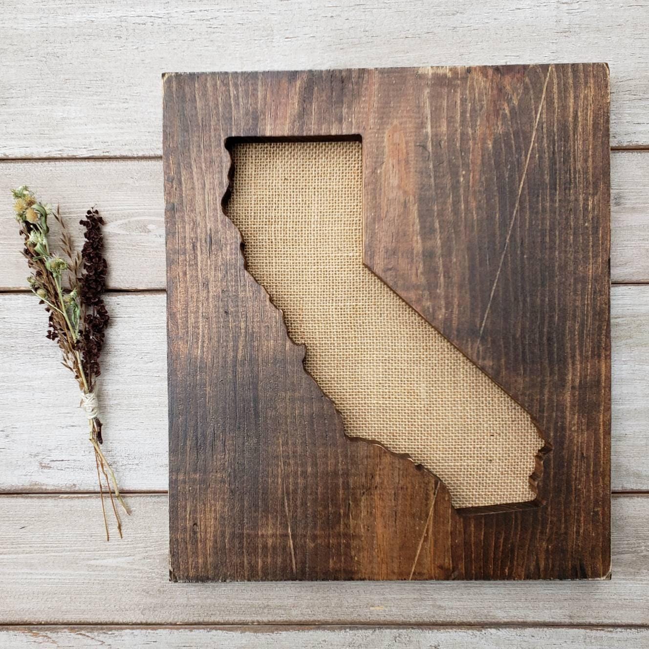 All signs arrive ready to hang and sizes are listed in the drop-down menu - each state is set on the board size that best showcases it's shape. The wood is stained your choice of dark walnut, grey, or our rustic wood look. All options have sanded edges and board appearance may vary from the pictures since each piece of wood has it's own character and uniqueness. Tan burlap is fastened to the back of the sign to compliment the wood board.