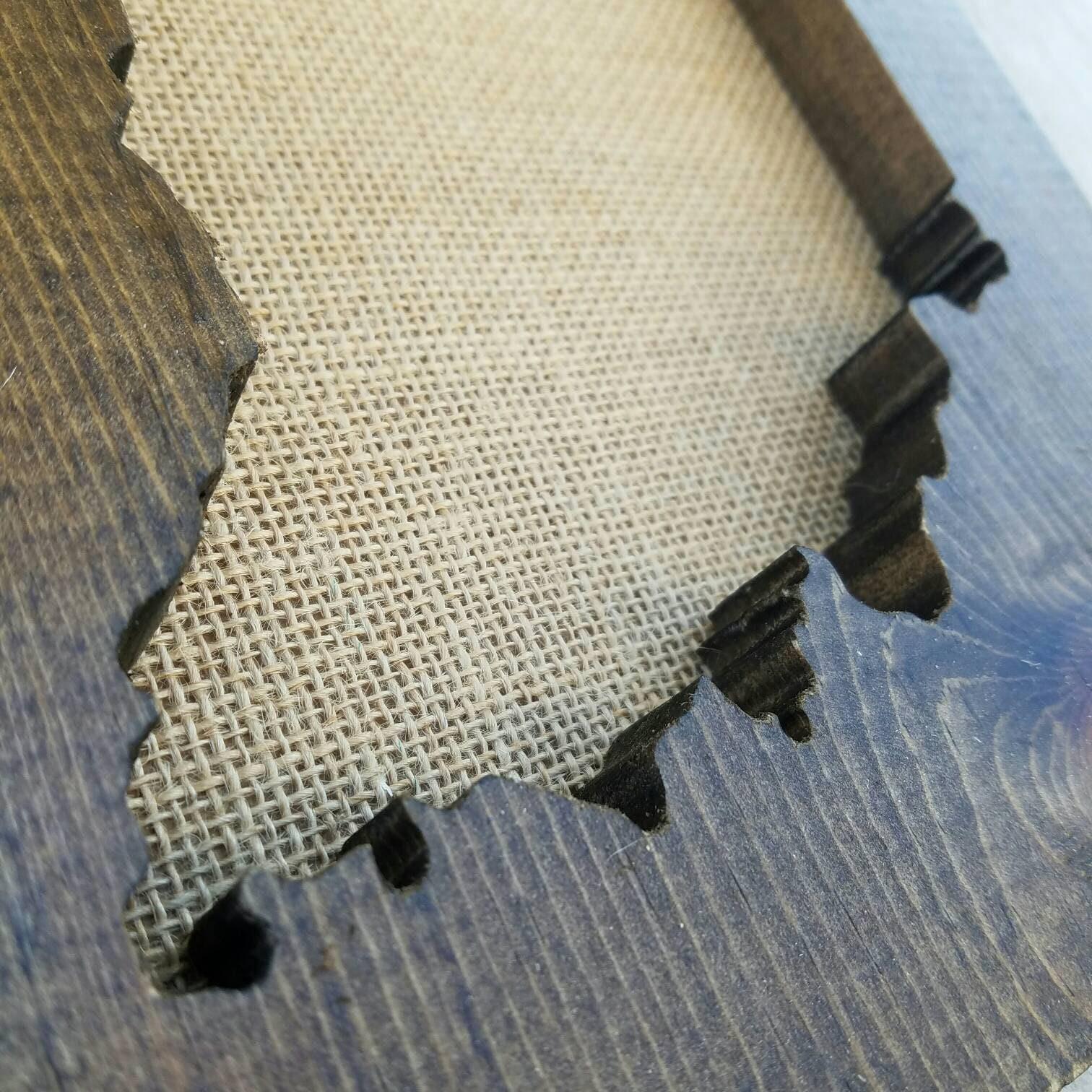 All signs arrive ready to hang and sizes are listed in the drop-down menu - each state is set on the board size that best showcases it's shape. The wood is stained your choice of dark walnut, grey, or our rustic wood look. All options have sanded edges and board appearance may vary from the pictures since each piece of wood has it's own character and uniqueness. Tan burlap is fastened to the back of the sign to compliment the wood board.