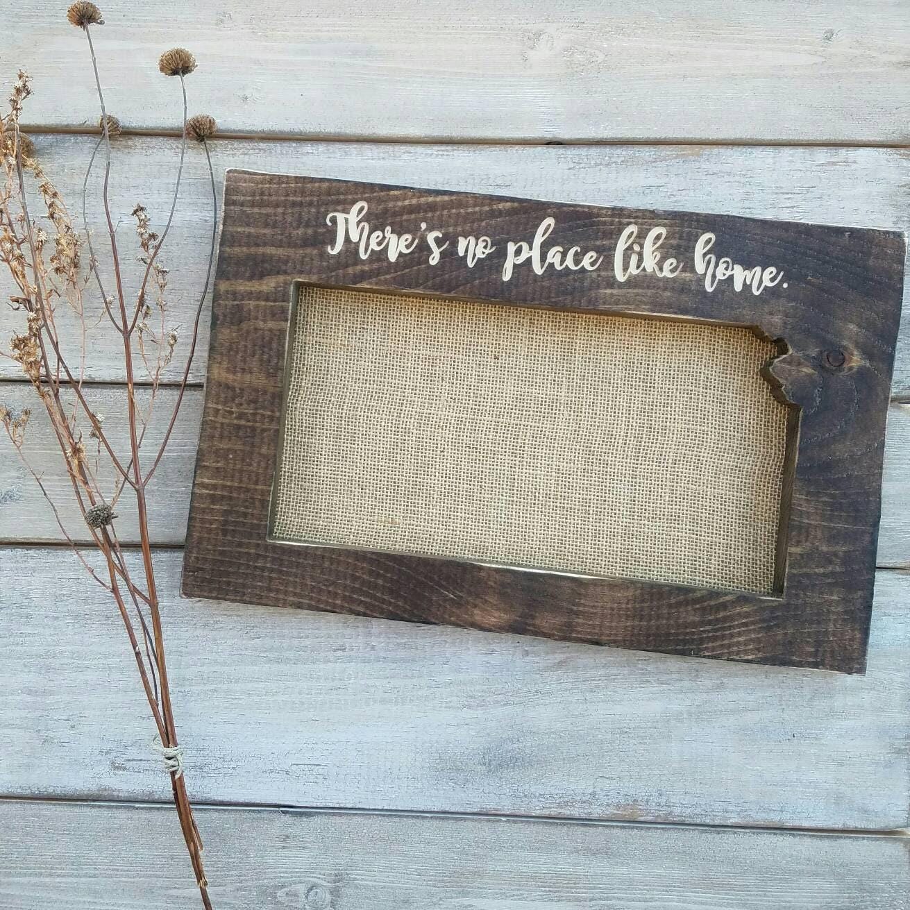 All signs arrive ready to hang and sizes are listed in the drop-down menu - each state is set on the board size that best showcases it's shape. The wood is stained your choice of dark walnut, grey, or our rustic wood look. All options have sanded edges and board appearance may vary from the pictures since each piece of wood has it's own character and uniqueness. Tan burlap is fastened to the back of the sign to compliment the wood board.