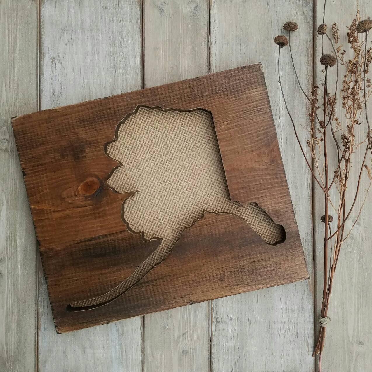 All signs arrive ready to hang and sizes are listed in the drop-down menu - each state is set on the board size that best showcases it's shape. The wood is stained your choice of dark walnut, grey, or our rustic wood look. All options have sanded edges and board appearance may vary from the pictures since each piece of wood has it's own character and uniqueness. Tan burlap is fastened to the back of the sign to compliment the wood board.