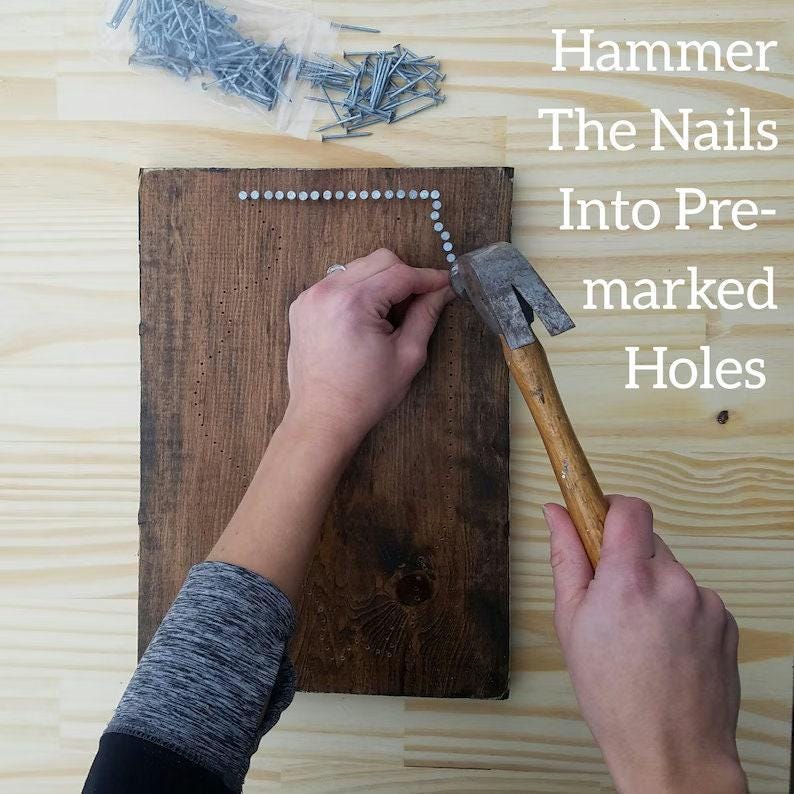 In these kits you will find everything you need to create your own state string art sign (except a hammer!). The dirty work is already done as the board comes cut and stained with the nail holes already marked out. All you need to do is grab a hammer, pound in the provided nails, and get busy stringing!