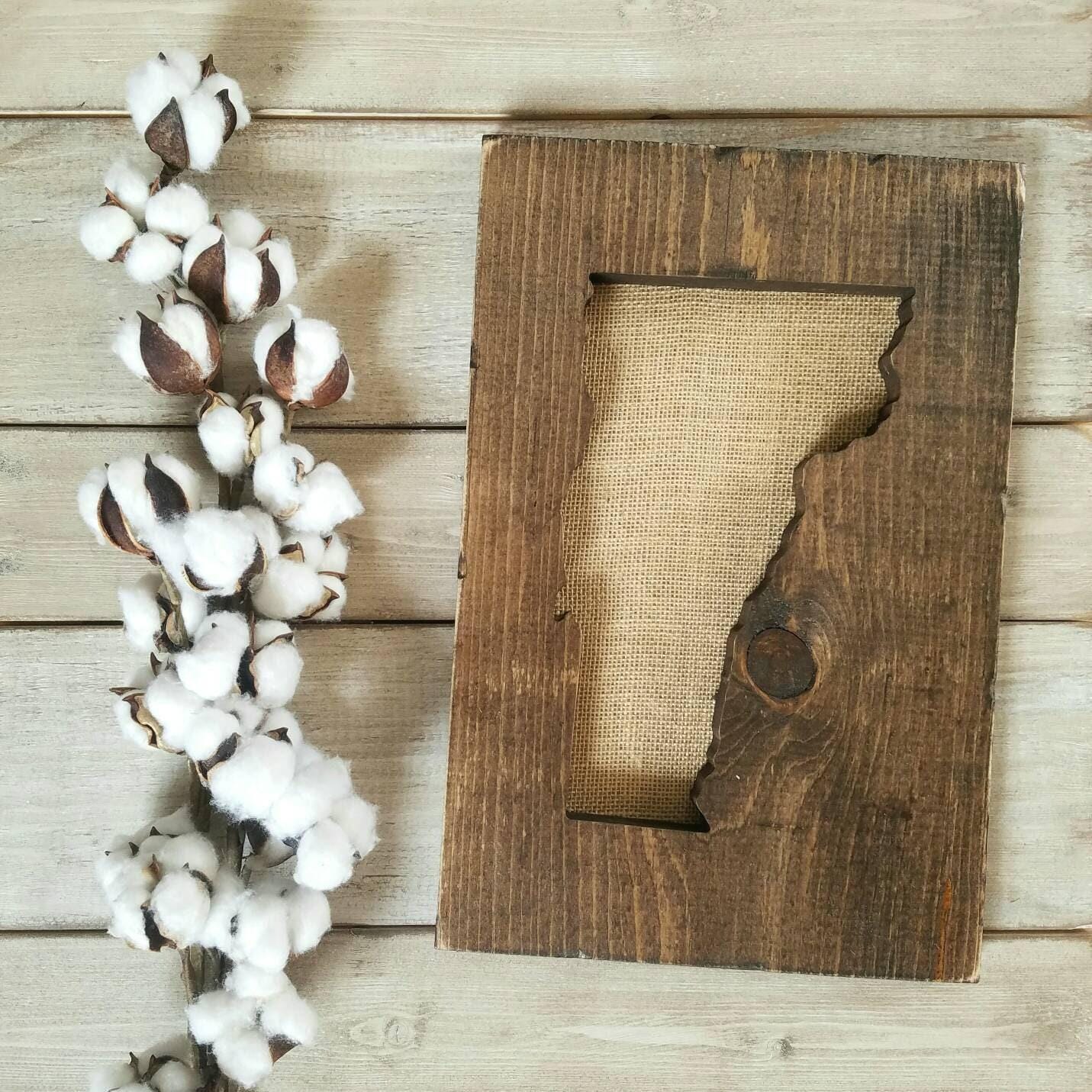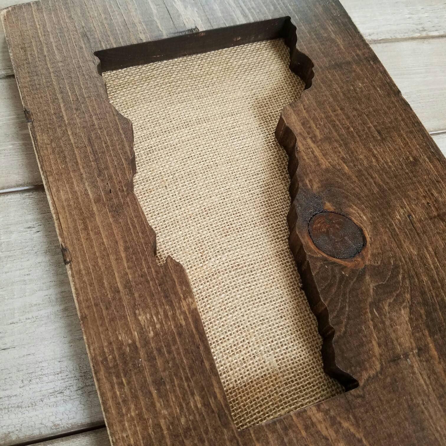 All signs arrive ready to hang and sizes are listed in the drop-down menu - each state is set on the board size that best showcases it's shape. The wood is stained your choice of dark walnut, grey, or our rustic wood look. All options have sanded edges and board appearance may vary from the pictures since each piece of wood has it's own character and uniqueness. Tan burlap is fastened to the back of the sign to compliment the wood board.