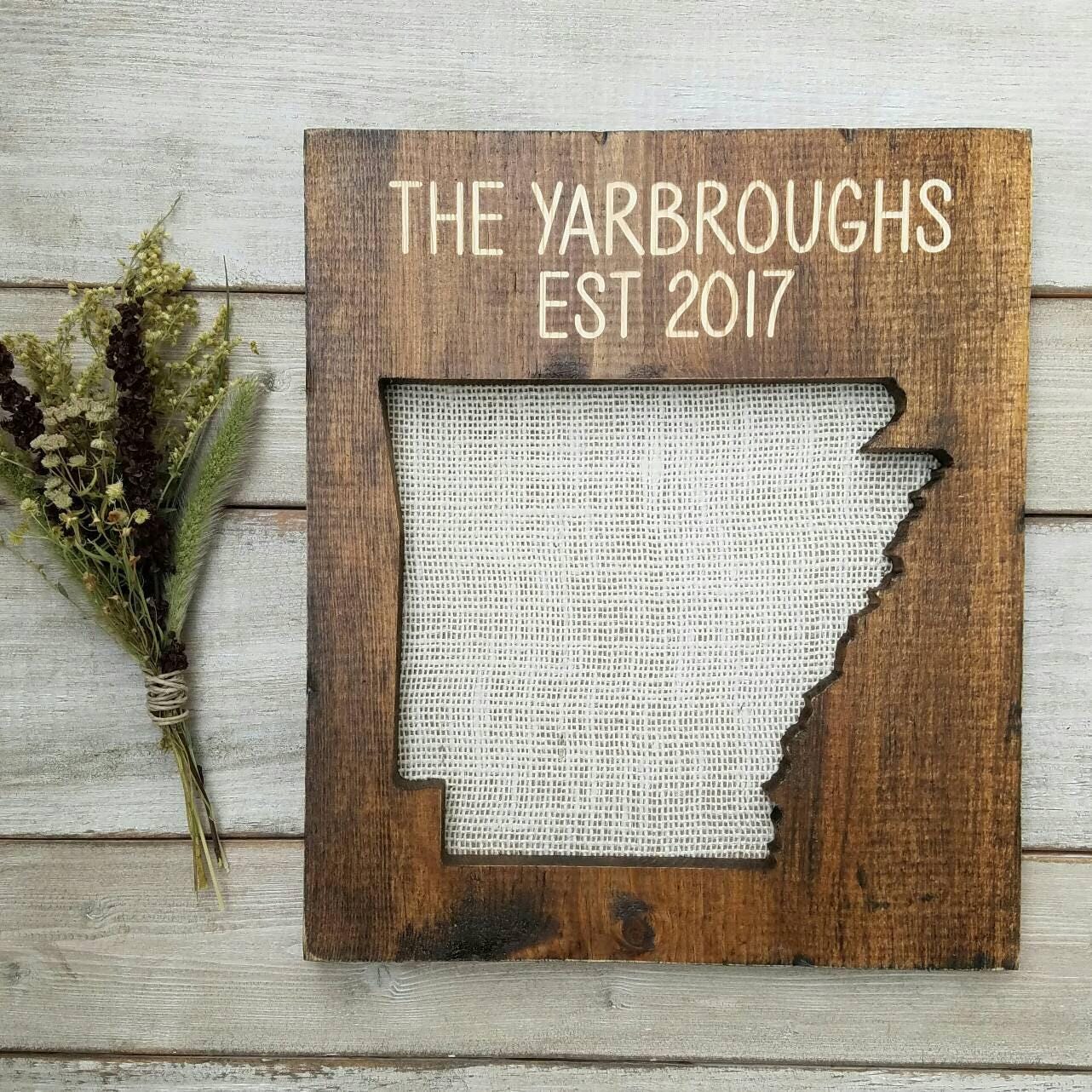 All signs arrive ready to hang and sizes are listed in the drop-down menu - each state is set on the board size that best showcases it's shape. The wood is stained your choice of dark walnut, grey, or our rustic wood look. All options have sanded edges and board appearance may vary from the pictures since each piece of wood has it's own character and uniqueness. Tan burlap is fastened to the back of the sign to compliment the wood board.