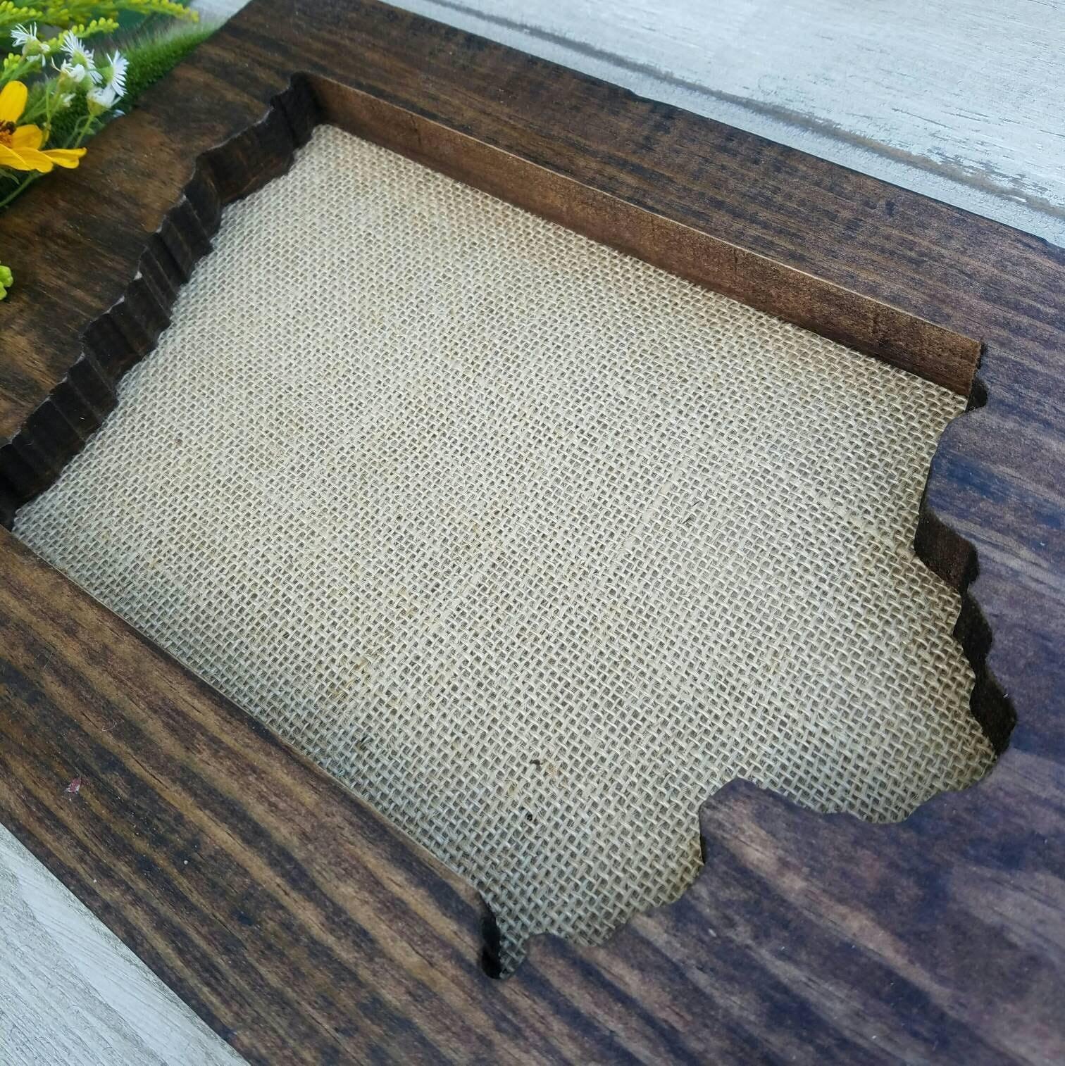 All signs arrive ready to hang and sizes are listed in the drop-down menu - each state is set on the board size that best showcases it's shape. The wood is stained your choice of dark walnut, grey, or our rustic wood look. All options have sanded edges and board appearance may vary from the pictures since each piece of wood has it's own character and uniqueness. Tan burlap is fastened to the back of the sign to compliment the wood board.