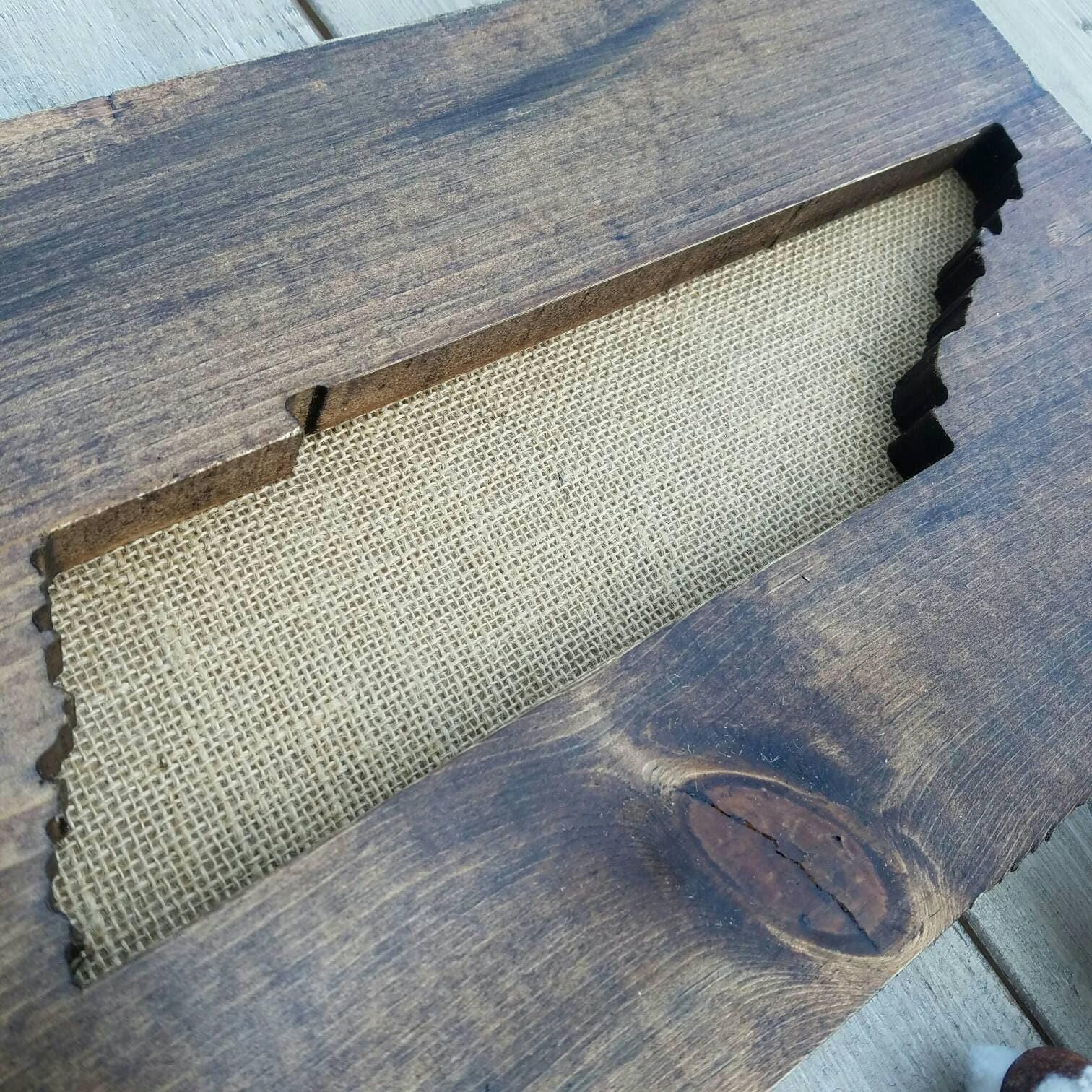 All signs arrive ready to hang and sizes are listed in the drop-down menu - each state is set on the board size that best showcases it's shape. The wood is stained your choice of dark walnut, grey, or our rustic wood look. All options have sanded edges and board appearance may vary from the pictures since each piece of wood has it's own character and uniqueness. Tan burlap is fastened to the back of the sign to compliment the wood board.