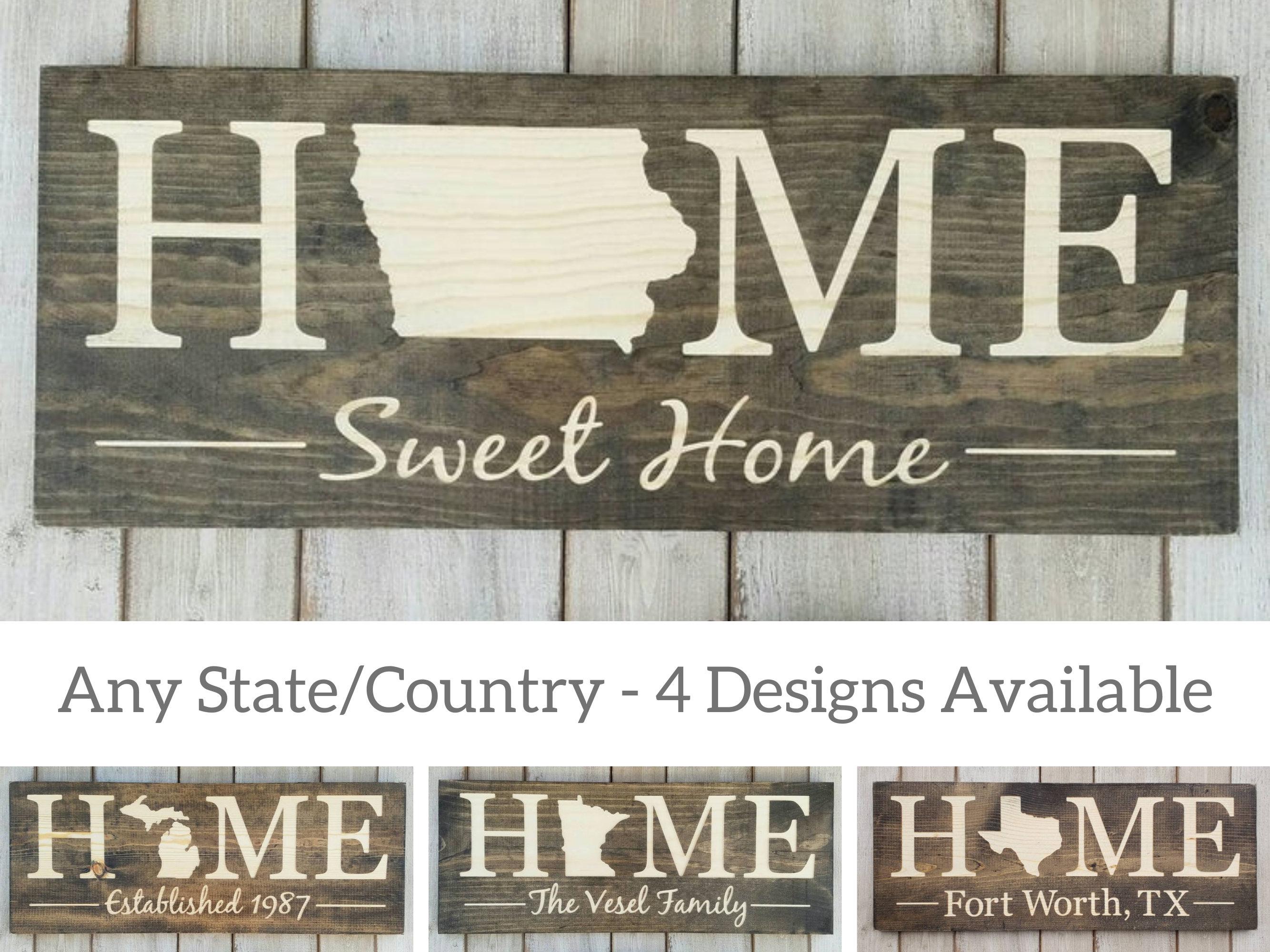 Where do you call home?!? Show off your state pride with our Home Sweet Home Sign. All 50 states are available along with 4 design options or a custom design of your choice!
