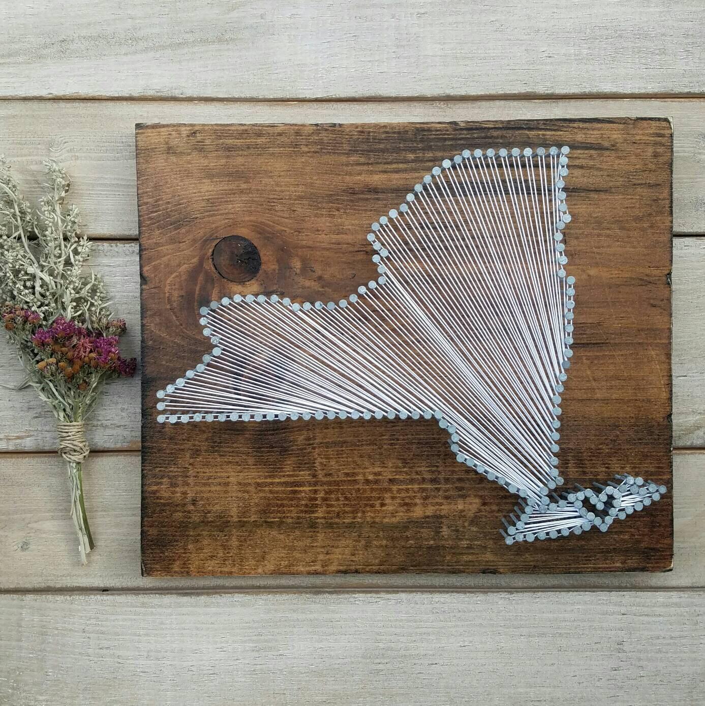 The DIY kit option include everything you need to create your own state string art sign (except a hammer!). The dirty work is already done as the board comes cut and stained with the nail holes already marked out. All you need to do is grab a hammer, pound in the provided nails, and get busy stringing!