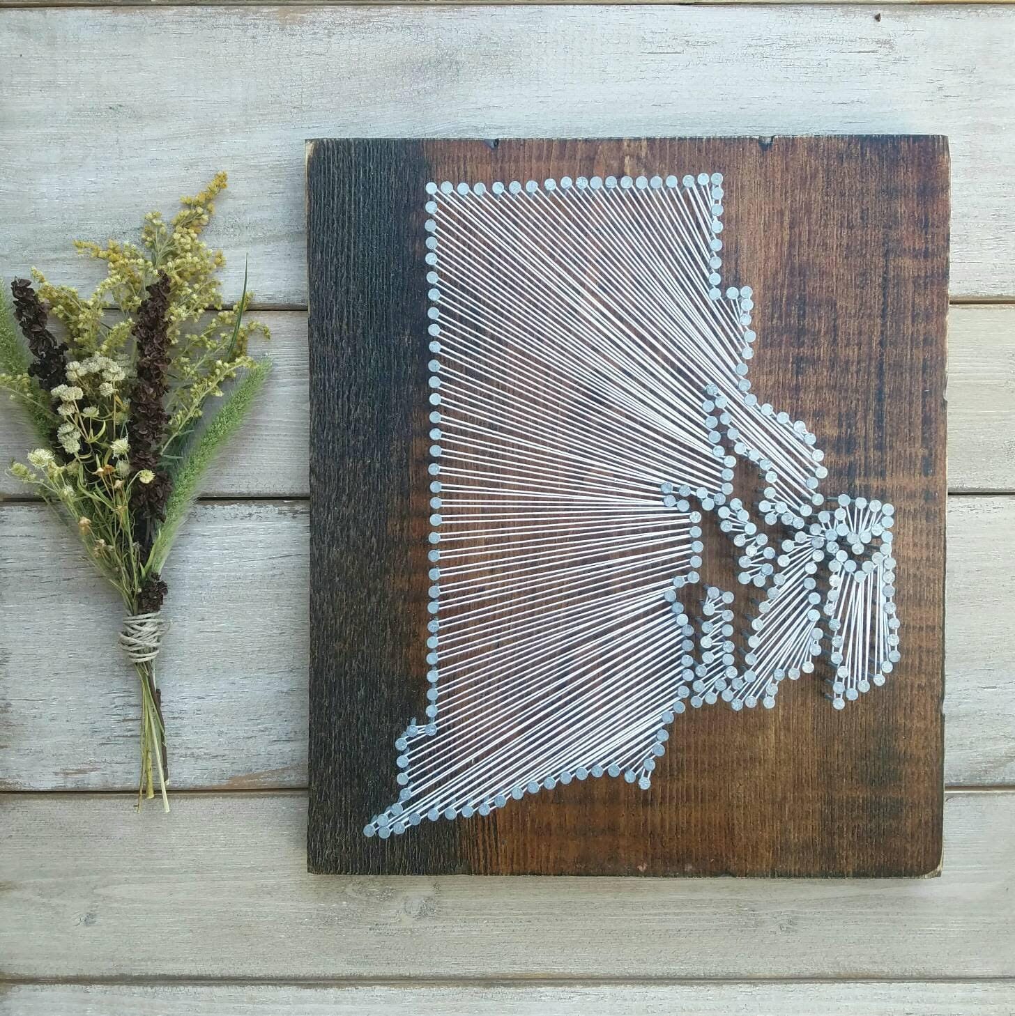 Discover a heartfelt way to commemorate your special moments with this Rhode Island string art, a perfect blend of rustic charm and personalized craftsmanship. This handmade wooden wall sign captures the essence of your story, whether it's marking a hometown, wedding location, or meaningful place. Designed as a unique state string art piece, it makes an unforgettable gift that celebrates love and memories.