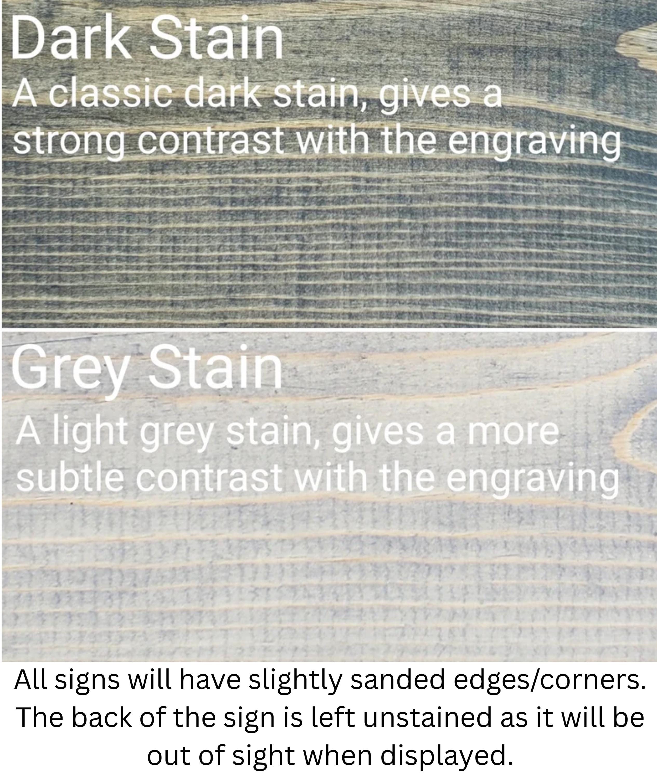 Please note: Each sign’s wood grain and color vary slightly, ensuring every piece is truly one of a kind. The back of sign is unstained as it remains unseen when displayed.