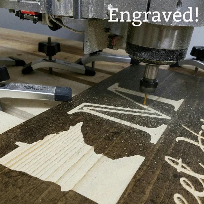 A custom engraving add-on is available for String Art, DIY kits, & Burlap Signs - the design is engraved within the wood revealing the natural wood color below, knots and all.