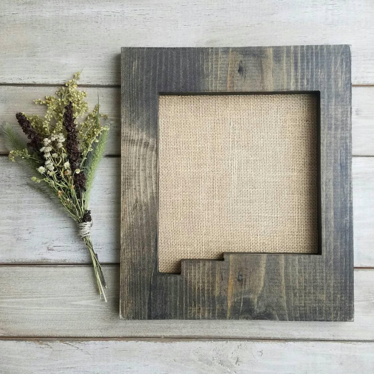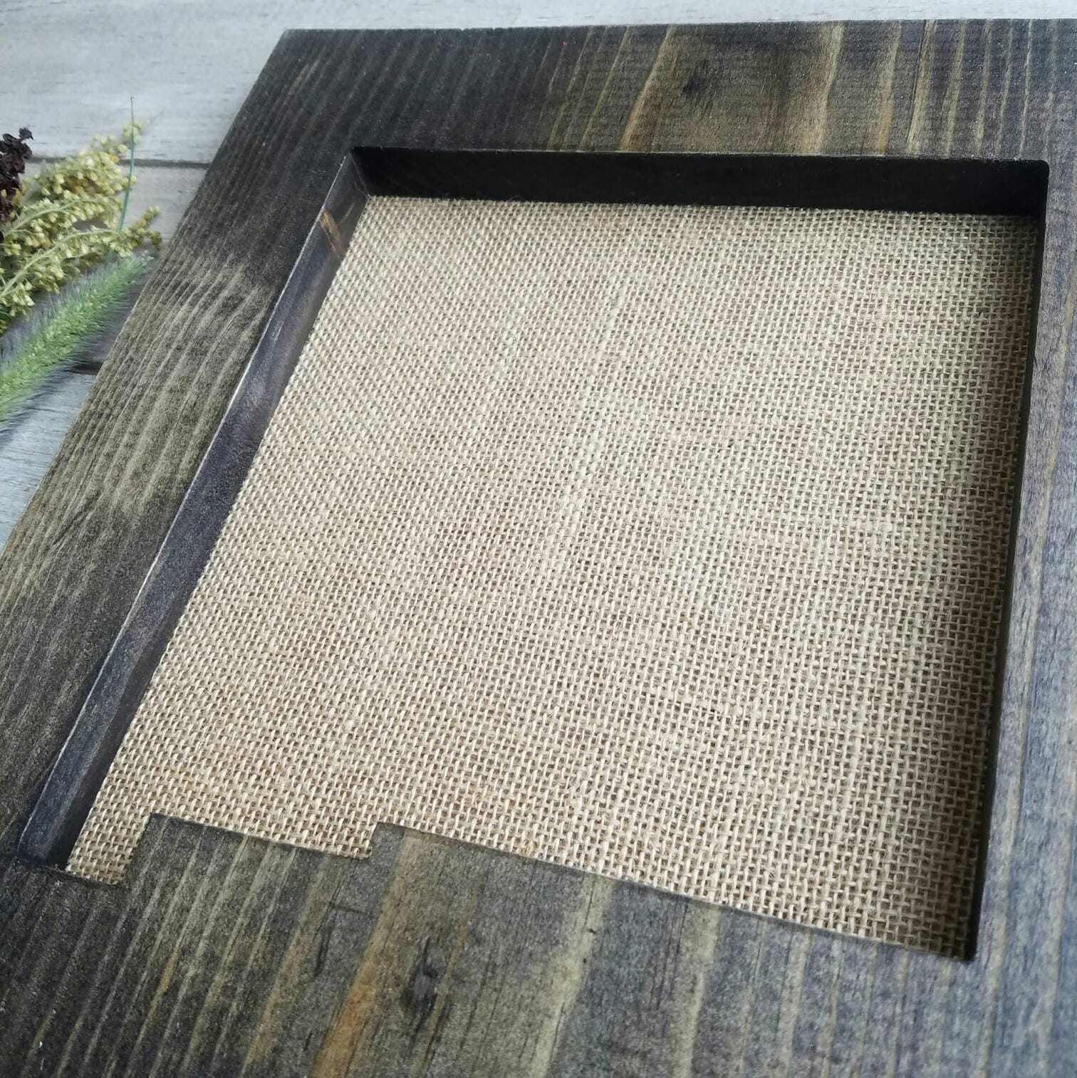 All signs arrive ready to hang and sizes are listed in the drop-down menu - each state is set on the board size that best showcases it's shape. The wood is stained your choice of dark walnut, grey, or our rustic wood look. All options have sanded edges and board appearance may vary from the pictures since each piece of wood has it's own character and uniqueness. Tan burlap is fastened to the back of the sign to compliment the wood board.