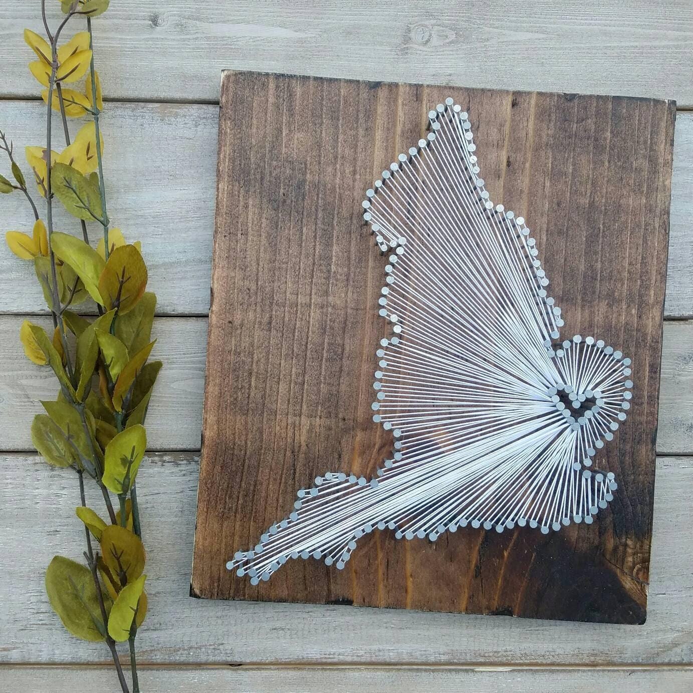 The DIY kit option include everything you need to create your own state string art sign (except a hammer!). The dirty work is already done as the board comes cut and stained with the nail holes already marked out. All you need to do is grab a hammer, pound in the provided nails, and get busy stringing!