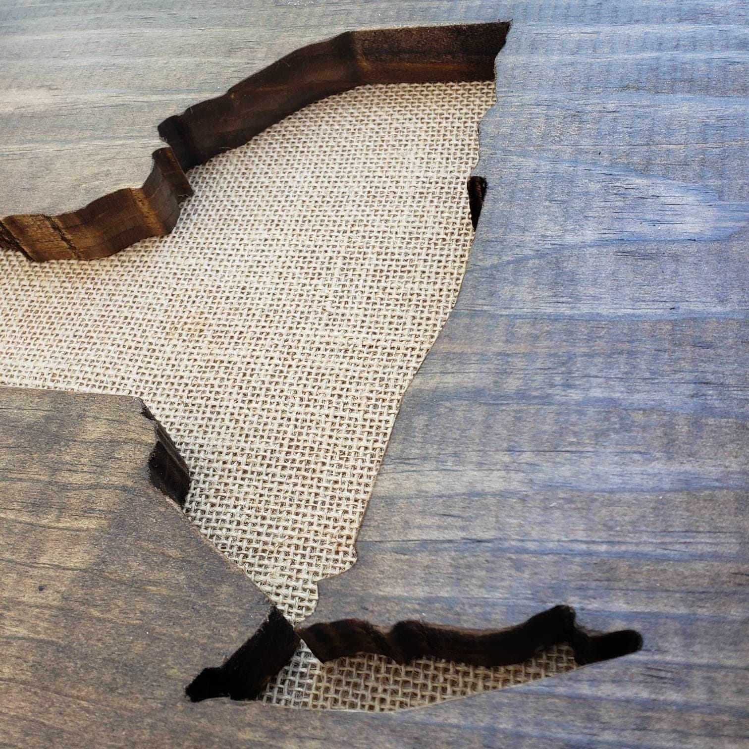 All signs arrive ready to hang and sizes are listed in the drop-down menu - each state is set on the board size that best showcases it's shape. The wood is stained your choice of dark walnut, grey, or our rustic wood look. All options have sanded edges and board appearance may vary from the pictures since each piece of wood has it's own character and uniqueness. Tan burlap is fastened to the back of the sign to compliment the wood board.