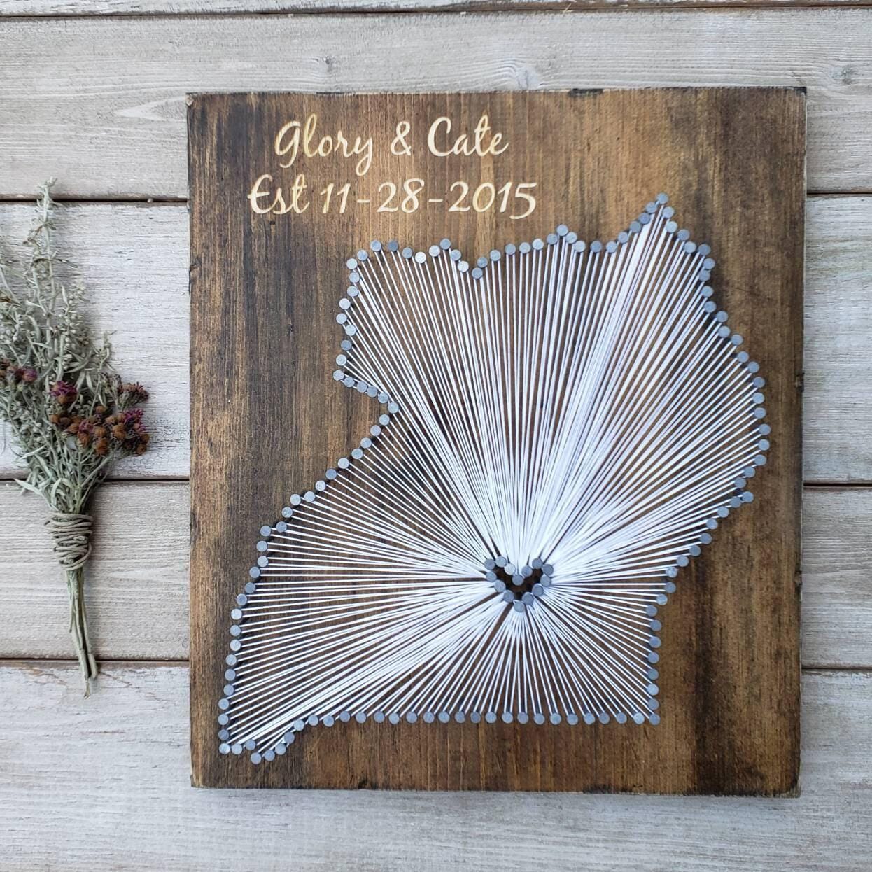 All pieces are crafted with attention to detail; note that wood boards may vary slightly due to their natural wood character. The back of the sign is left unstained as it will be out of sight when displayed. **Heart Locations on the border will be pulled away from the border so that they are completely surrounded by string --unless-- your heart location is in a tight area or requested otherwise. Heart is left open unless a request is made for it to be filled with another string color.