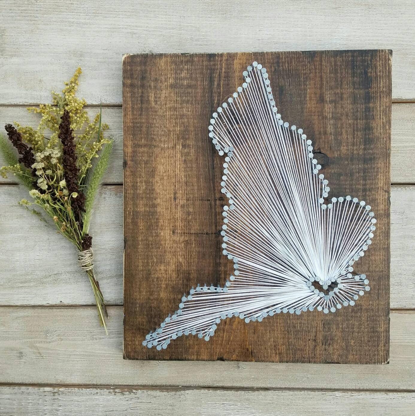 The DIY kit option include everything you need to create your own state string art sign (except a hammer!). The dirty work is already done as the board comes cut and stained with the nail holes already marked out. All you need to do is grab a hammer, pound in the provided nails, and get busy stringing!