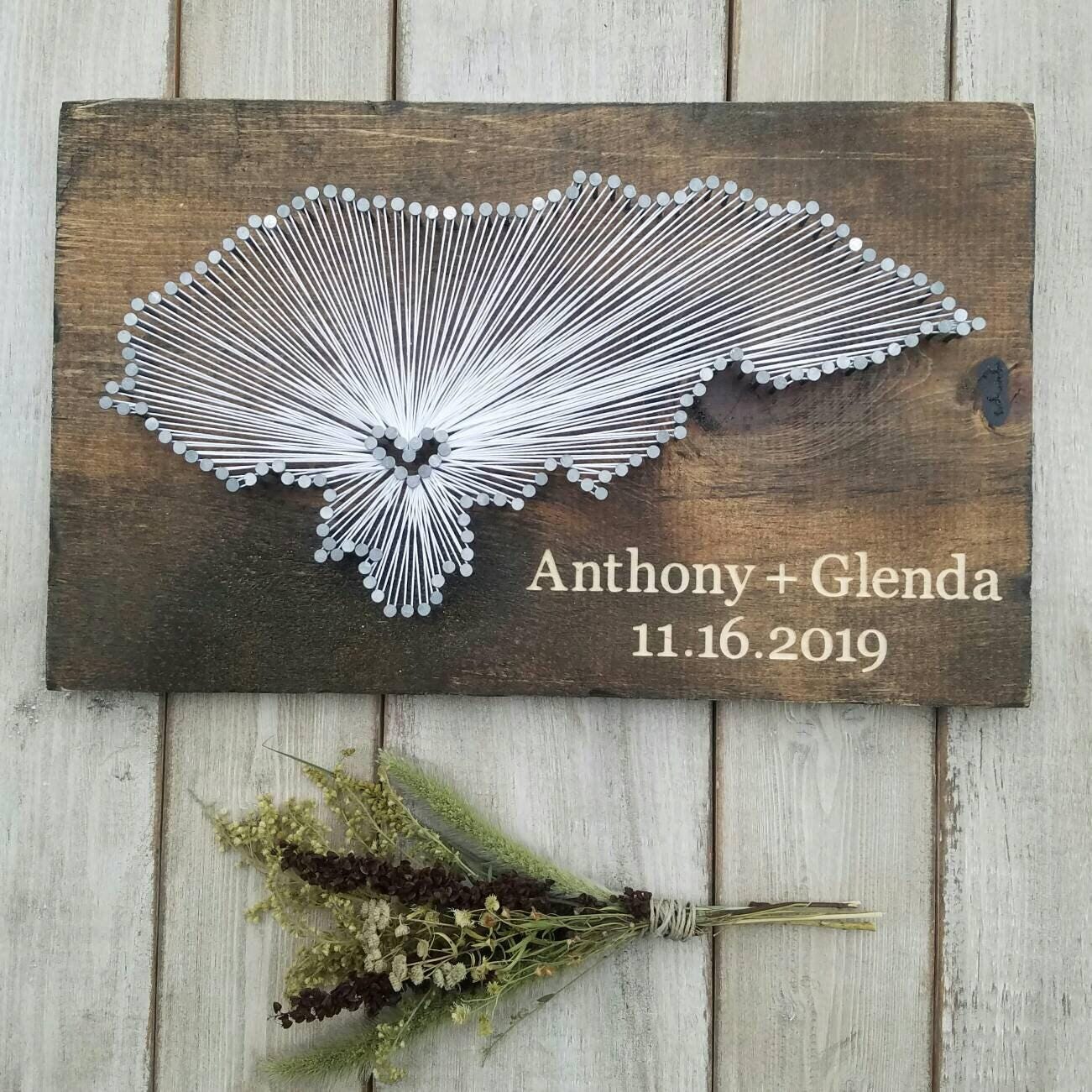 All pieces are crafted with attention to detail; note that wood boards may vary slightly due to their natural wood character. The back of the sign is left unstained as it will be out of sight when displayed. **Heart Locations on the border will be pulled away from the border so that they are completely surrounded by string --unless-- your heart location is in a tight area or requested otherwise. Heart is left open unless a request is made for it to be filled with another string color.