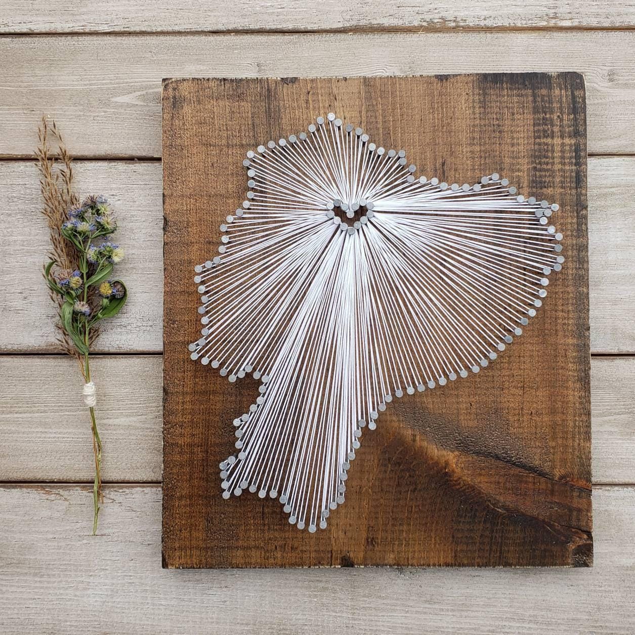 The DIY kit option include everything you need to create your own state string art sign (except a hammer!). The dirty work is already done as the board comes cut and stained with the nail holes already marked out. All you need to do is grab a hammer, pound in the provided nails, and get busy stringing!