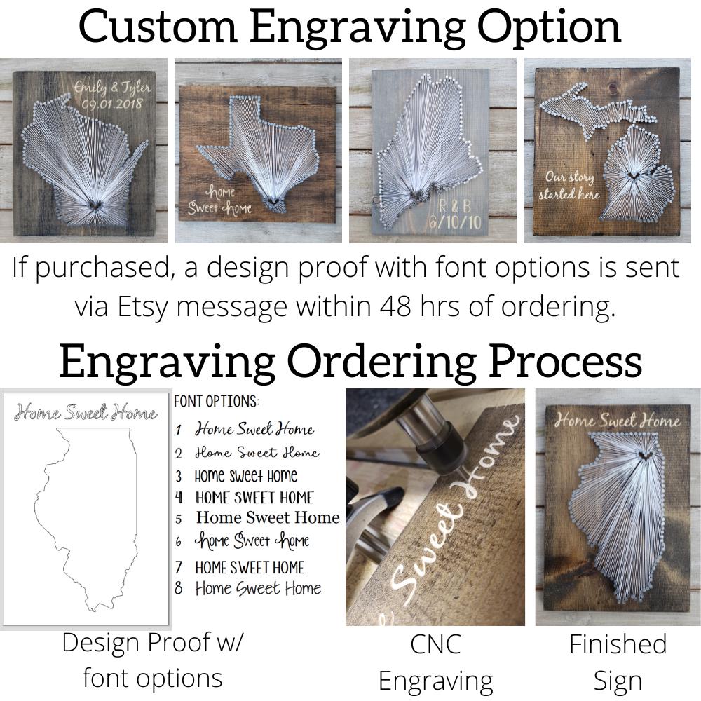 A custom engraving add-on is available for String Art, DIY kits, & Burlap Signs - the design is engraved within the wood revealing the natural wood color below, knots and all.