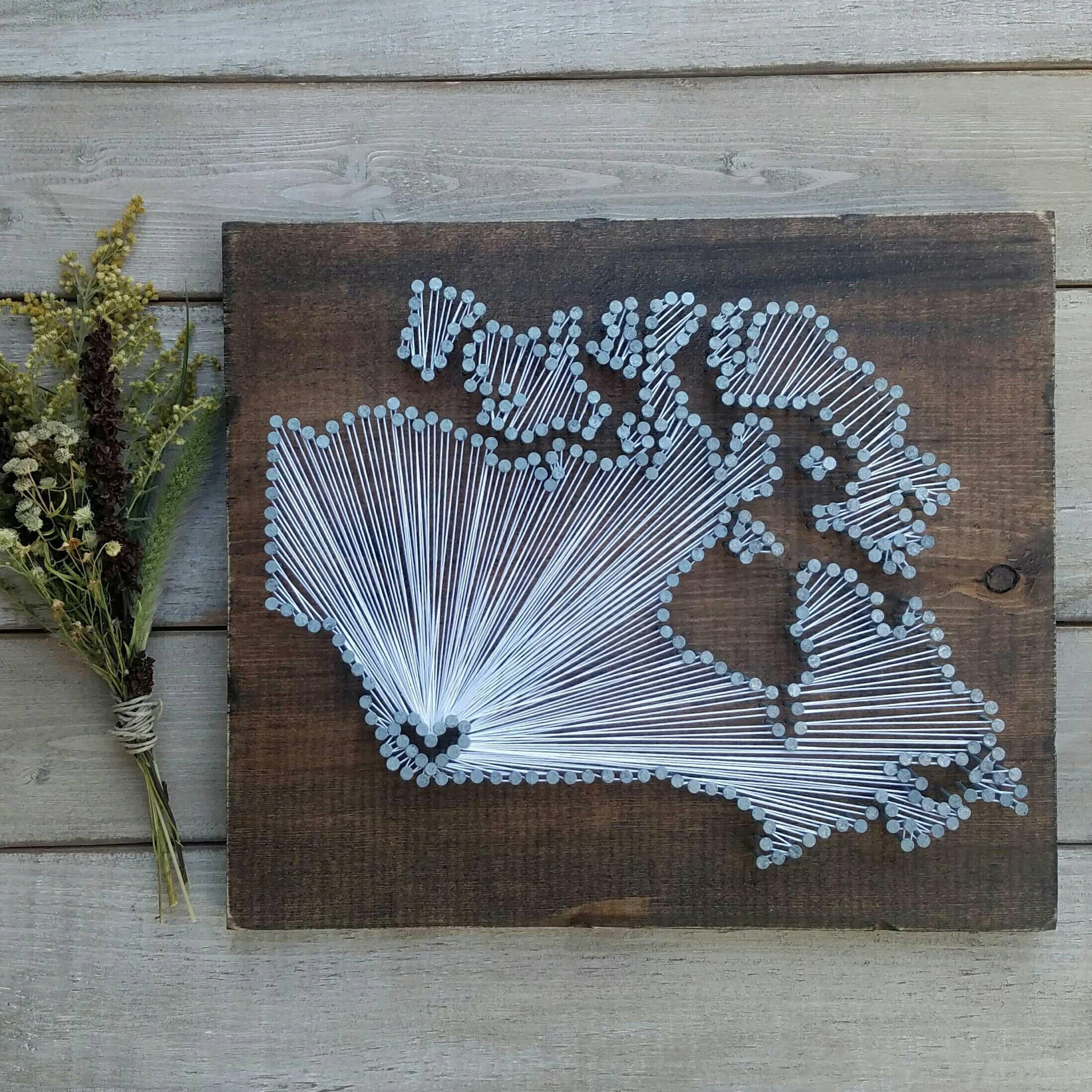 The DIY kit option include everything you need to create your own state string art sign (except a hammer!). The dirty work is already done as the board comes cut and stained with the nail holes already marked out. All you need to do is grab a hammer, pound in the provided nails, and get busy stringing!