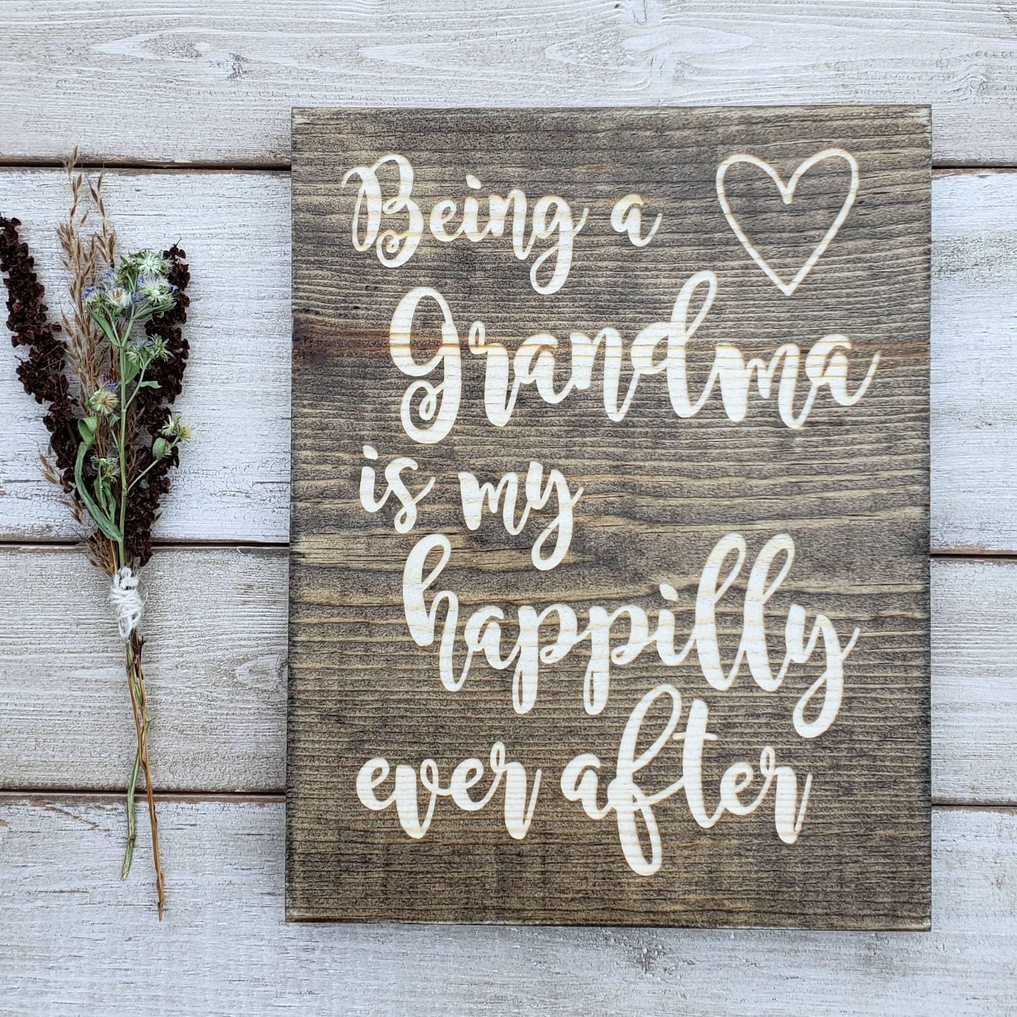 Celebrate the special bond of grandmotherhood with this beautifully engraved wood sign, a perfect gift for grandma or a thoughtful Mother's Day gift. Crafted to honor the joy of being a grandma, this custom sign captures the heartfelt sentiment of "Being a Grandma is My Happily Ever After" in timeless style. Each piece is uniquely made, blending rustic charm with elegant engraving that makes it a treasured keepsake.